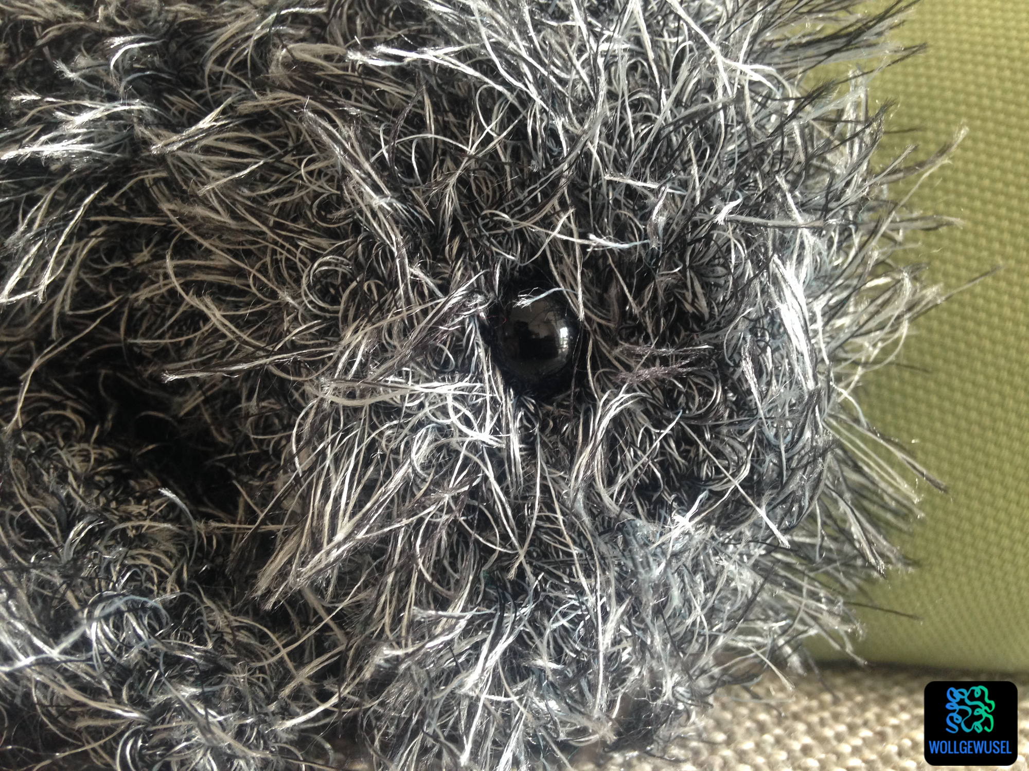 Als Augen habe ich 11mm Sicherheitsaugen in einfarbig schwarz benutzt und Nase und Zehen an den Hinterfüßen wurden aufgestickt. Zum Glück sieht man das bei dem Garn nur sehr wenig. Sticken kann ich anscheinend genauso gut wie Knöpfe annähen. *seufz*