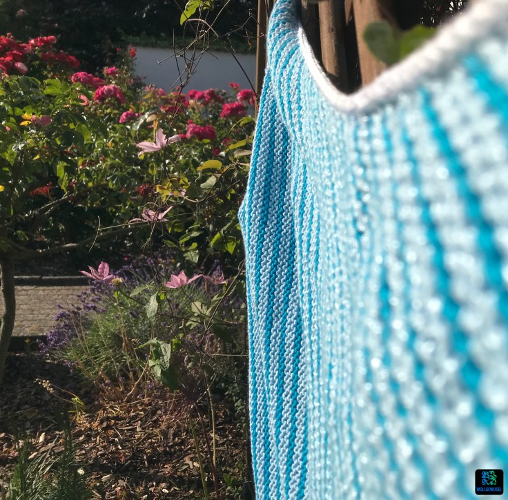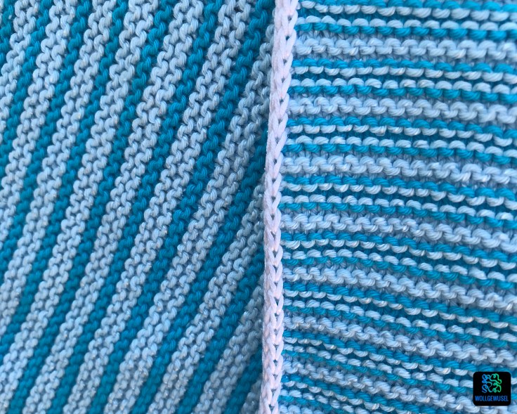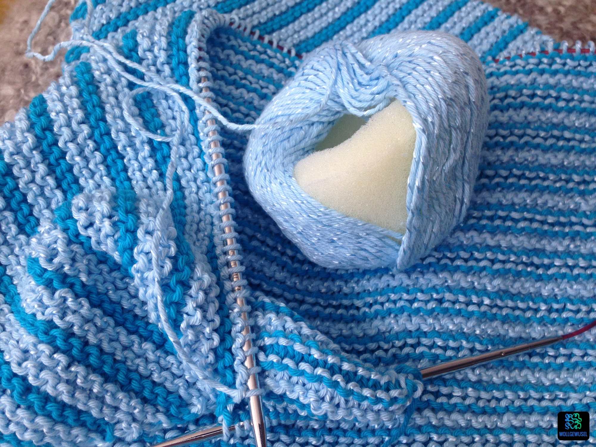 Da ich von dem hellblauen Garn fünf Knäule hatte, war schnell entschieden, dass ich nun halt nicht 1:1-Streifen stricke sondern im Verhältnis 2:1. Gesagt, getan. Und ich war recht schnell recht angetan.
