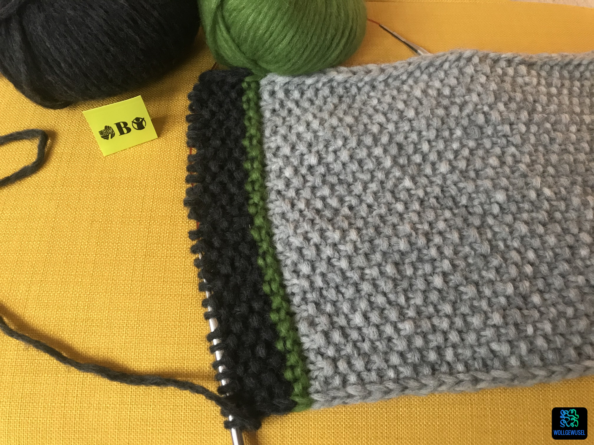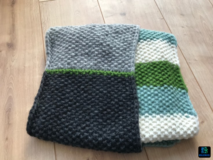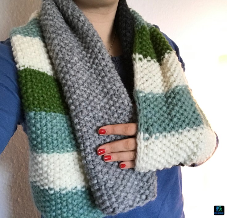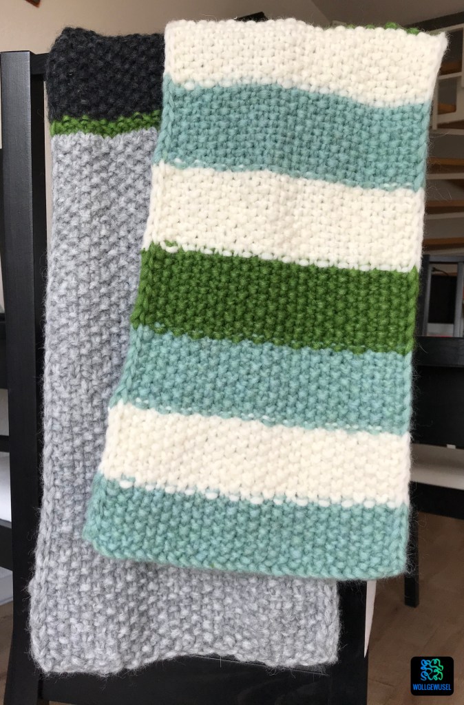 Unabhängig von diesem Aspekt hat mir dieses Jahr einfach die Farbzusammenstellung und das Design gefallen. Ungleichmäßige Streifen im Perlmuster. Eine schöne Randmasche wertet den Schal enorm auf und man kann wundderbar die Fäden darin vernähen.