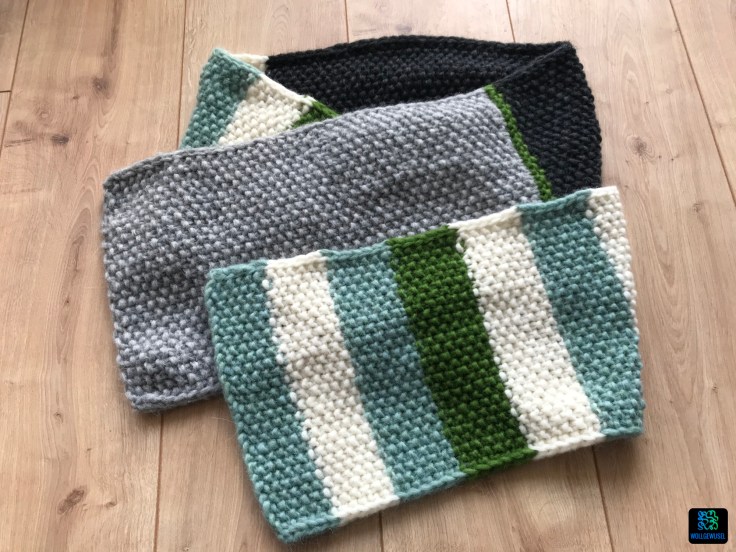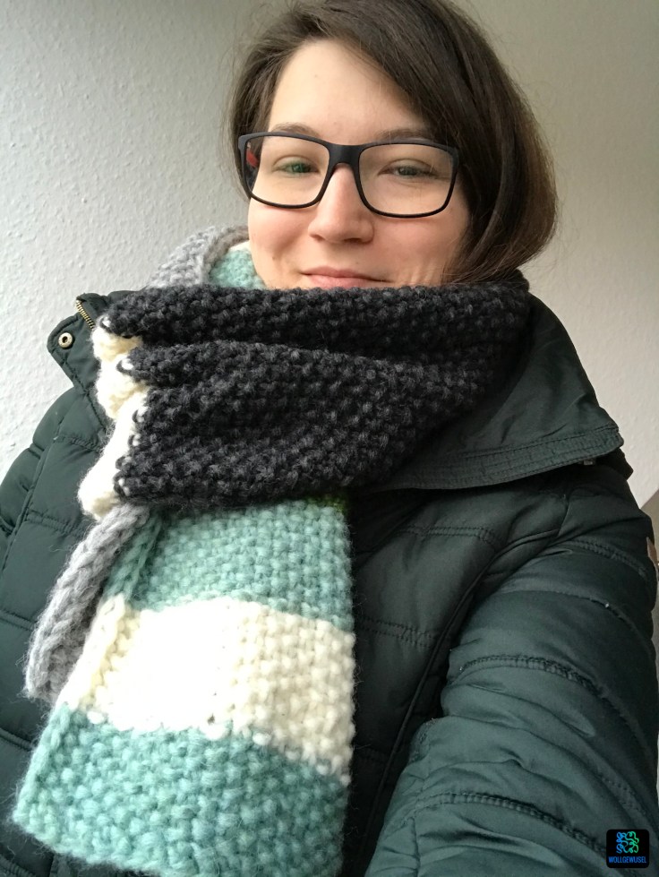 Ich trage eigentlich gar keine „normalen“ Schals, aber diesen habe ich schon fleißig ausgeführt. Er passt farblich zu einem Großteil meiner Garderobe und er ist wirklich schön warm. (Im Büro ist immer Eiszeit…)