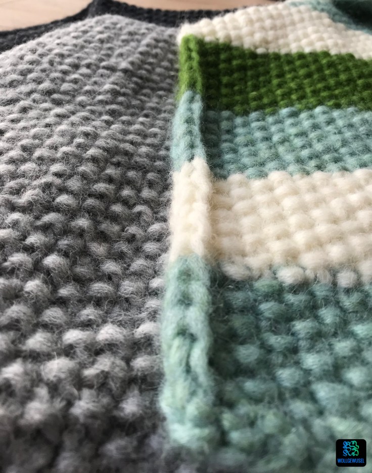 Wenn man es weiß, sieht man dass drei vier Maschen am Reihenende etwas dicker sind. Um das zu vermeiden, hätte man das Garn noch ausdünnen können, bevor man es einzieht. Aber das wird sich im Rahmen der Nutzung alles hinzotteln.