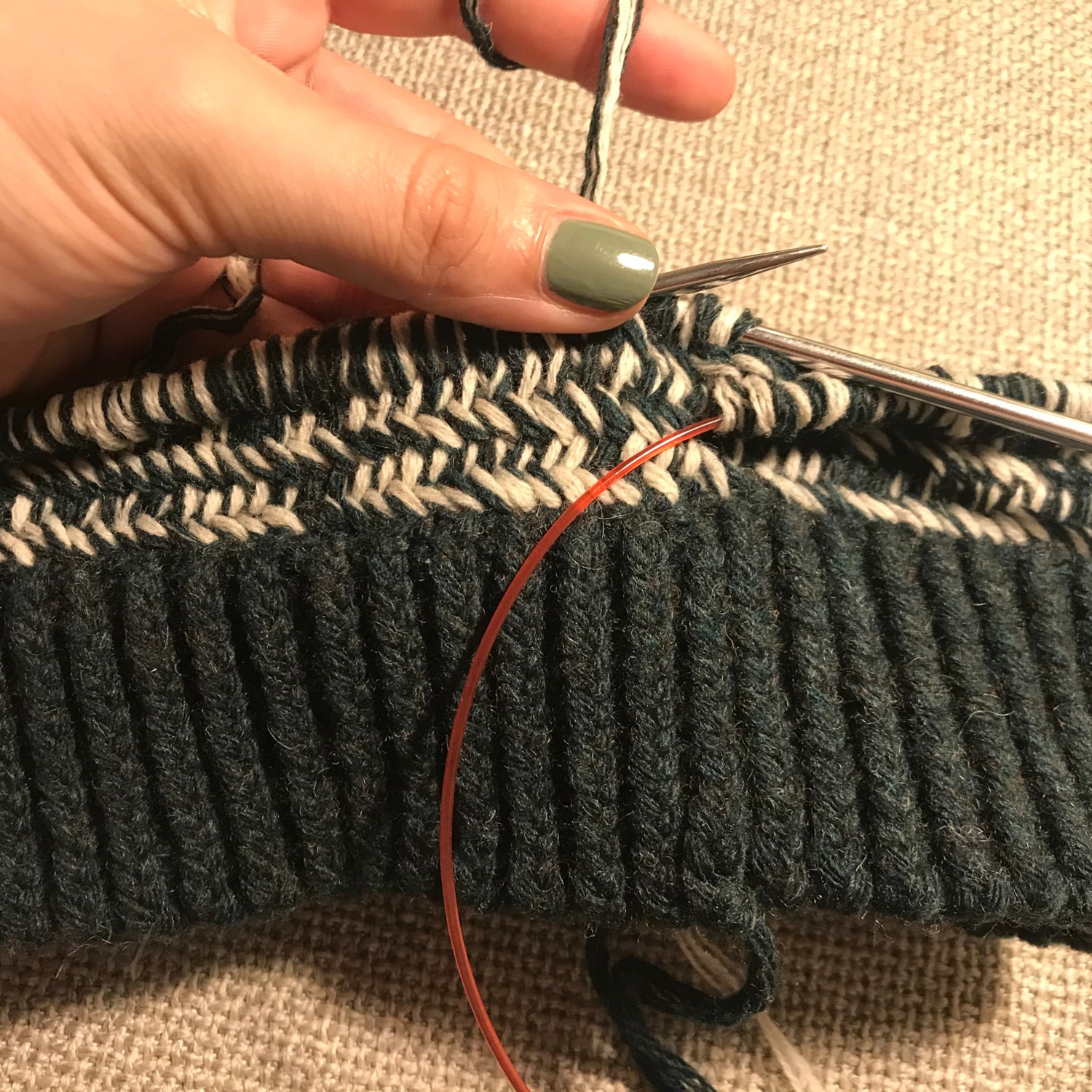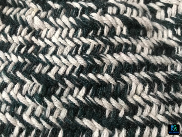Ich entscheid mich schlussendlich für das gefachte Handstrickgarn (Schurwolle/Poly), aus dem ich auch mein „Grünes Monster“, den Wayside Lace Cardigan, gestrickt hatte. Und da das Garn allein deutlich zu dünn für die Vorgabe aus der Anleitung war, habe ich es spontan doppelt genommen. Für das Bündchen noch uni grün und das Fischgrätenmuster sollte dann mit einem dunkelgrünen und einem weiß/naturfarbenen Faden gestrickt werden.