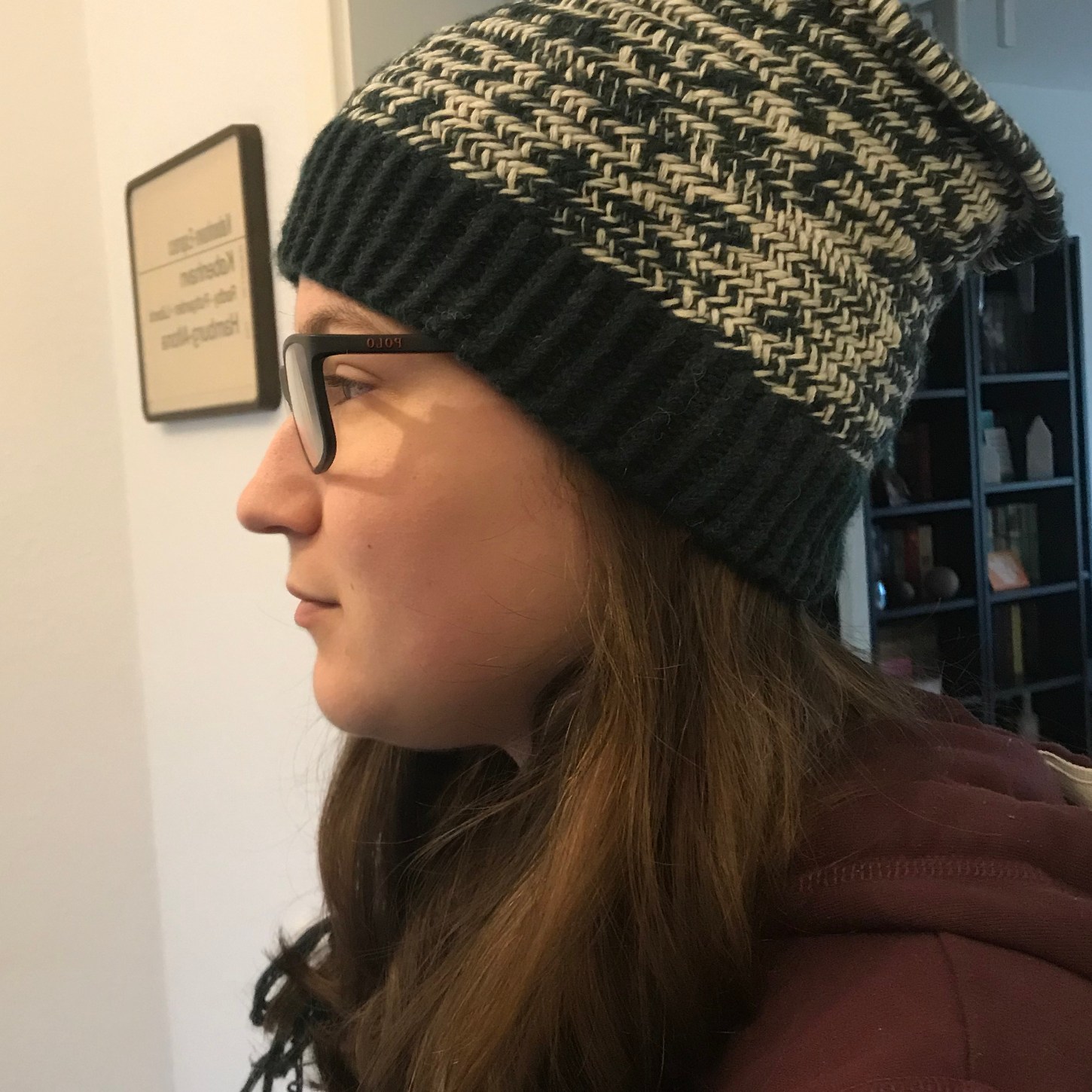 Oh, das war eine schwere Geburt. Aber nun kann ich euch eine fertige Mütze zeigen, die sogar schon eine stolze Besitzerin gefunden hat. Geworden ist es nun schlussendlich eine enganliegende Mütze im Fischgrätmuster mit Wollbommel.
