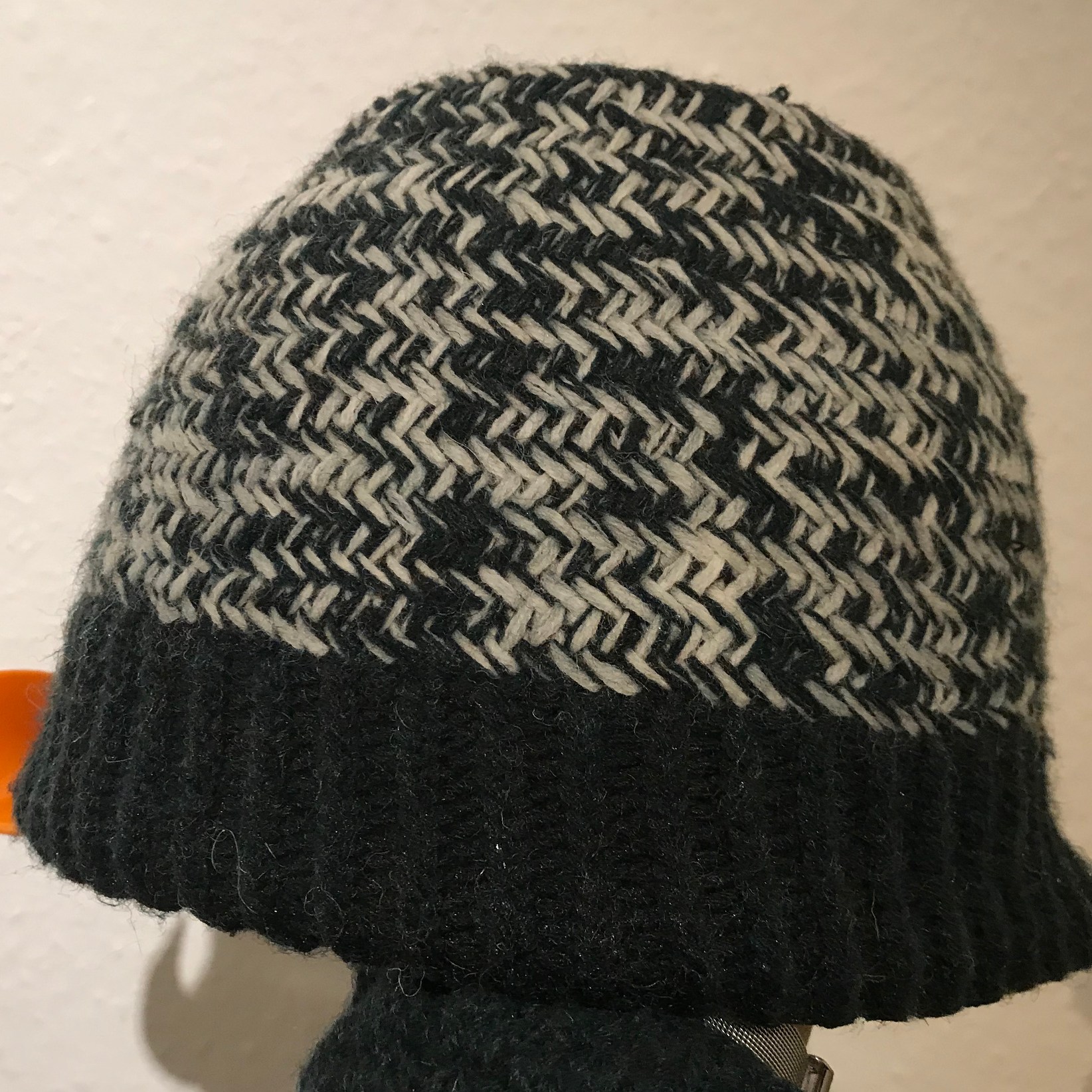 Naja, aber ab dem Bündchen wurde es chaotisch. Ich weiß nicht mehr, wie oft ich den Musterbereich teilweise oder ganz wieder aufgemacht habe. Das Gestrick war sehr steif und als ich es dann endlich zu etwas mehr Länge geschafft hatte, stellte ich fest, diese Mütze würde nie eine locker fallende Beanie werden, sondern immer eine Zipfelmütze mit Standkraft. :/