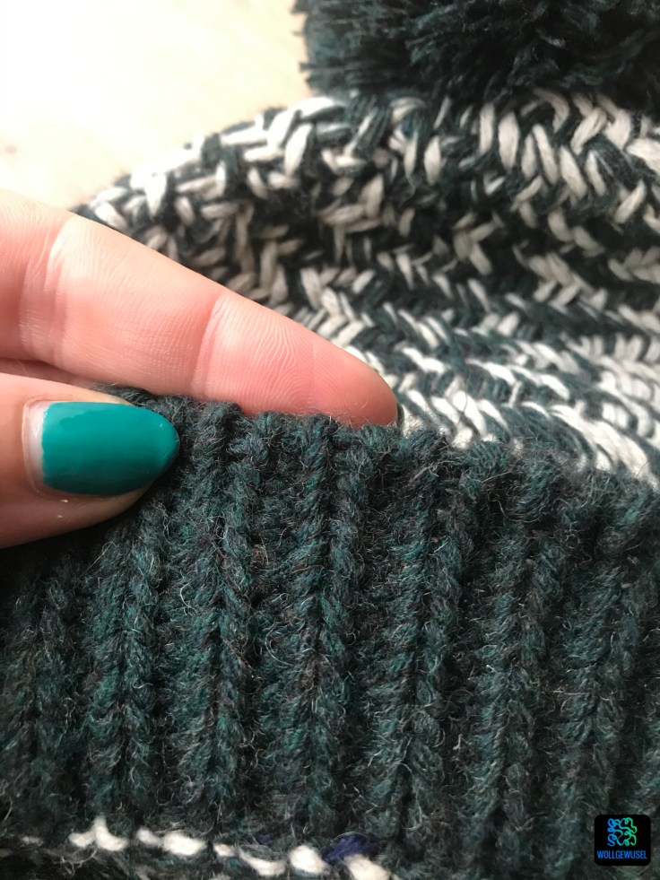 Laut Maschenprobe musste ich ein paar Maschen weniger anschlagen, um den richtigen Durchmesser zu erhalten. Angeschlagen habe ich die Maschen mit dem italienischen (Schlauch-)Anschlag und mit einer Nadelstärke kleiner als die restliche Mütze.