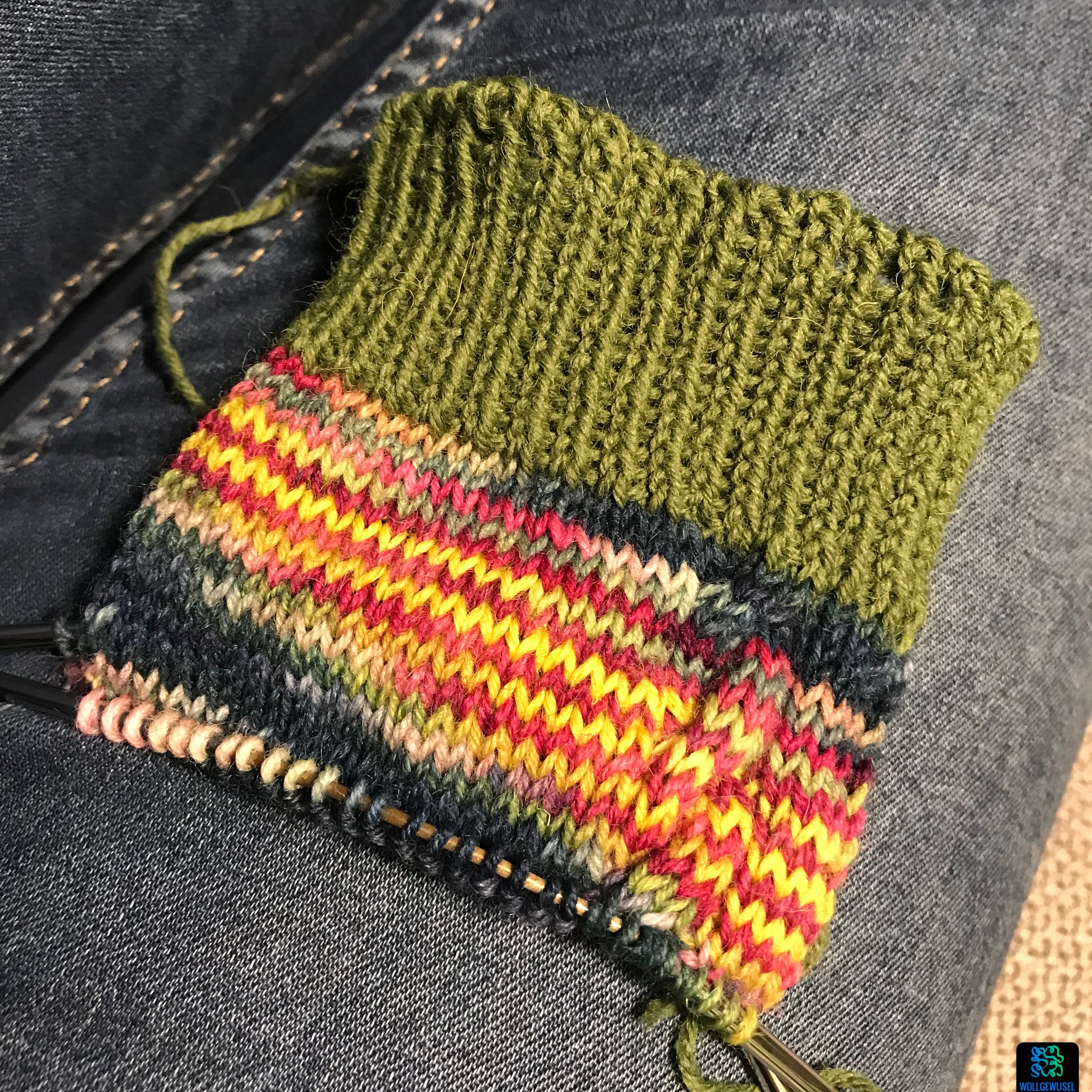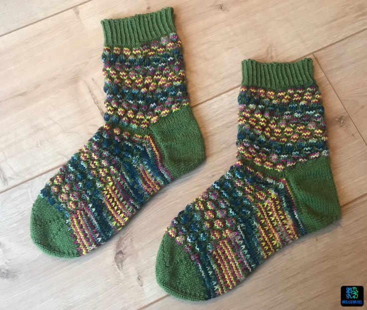 ..und dann hatte ich die Nase voll und bin auf die CajaSocks von Sockshype umgeschwenkt. Die hatte ich bereits im Teststrick der Anleitung stricken dürfen und durch das Bubble-Muster kann man super das sehr bunte Garn mit einem einfarbigen Garn kombinieren, alles ist schön sauber von einander abgegrenzt und es wirkt nicht völlig konfus. Egal wie bunt das Garn ist.