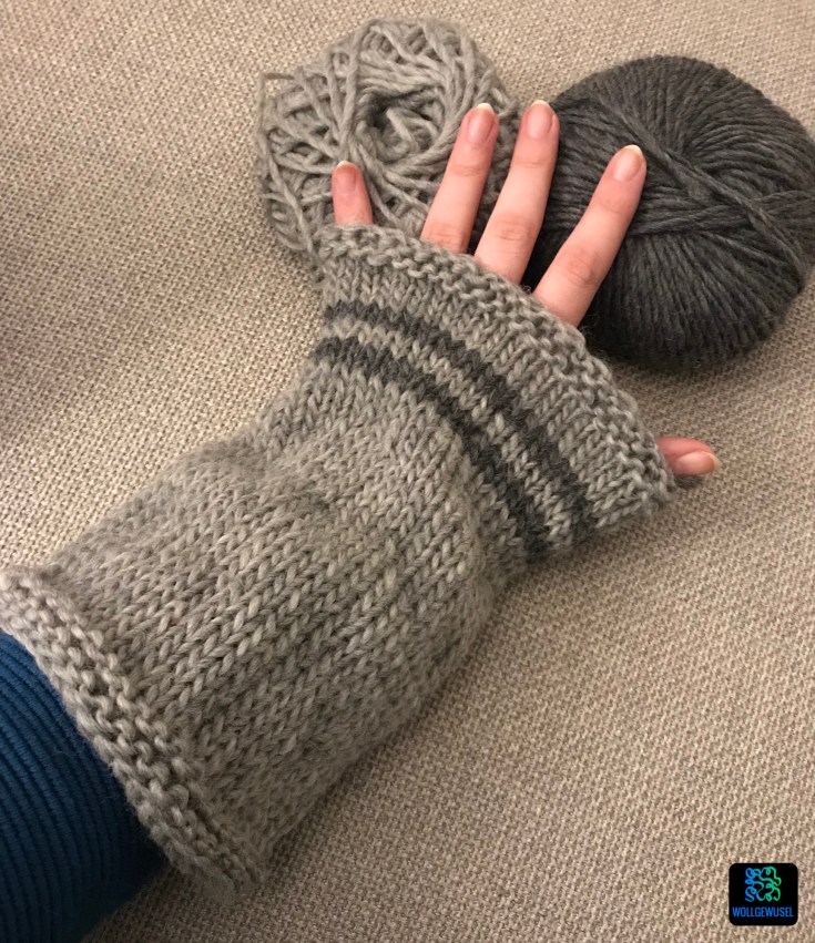 Da ich mehr Garn für die erste Stulpe verbraucht hatte als geplant, konnte ich nicht die zweite für das Paar anschlagen. Ich habe also noch mal eine in blaugrau angeschlagen mit hellgrauen Streifen. Dieses Mal habe ich versucht noch lockerer zu stricken und bin auch auf Nadelstärke 7,0mm umgestiegen. außerdem habe ich ein paar Runden mehr gestrickt, um die Länge etwas zu vergrößern.