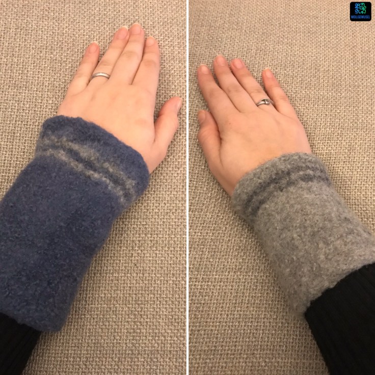 Nach Erhalt der Wolle konnte ich nun die jeweils zweite Stulpe stricken und filzen. Gestrickt wie die jeweils erste Stulpe bzgl. der Nadelstärke hatte ich gehofft am Ende zwei Paare zu erhalten, die sich zwar untereinander unterschieden, aber zumindest innerhalb des Paars gleich sind.