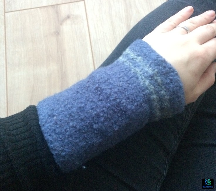 Auch hier hat das Garn nun natürlich nur für eine gereicht, aber die erste habe ich trotzdem gleich auch noch gefilzt. Gleiches Waschprogramm wie die erste, hellgraue Stulpe. Auch hier war etwas Ziehen und Zerren nötig, aber diese hat wirklich eine schöne Länge bekommen. Die gefällt mir wirklich gut.