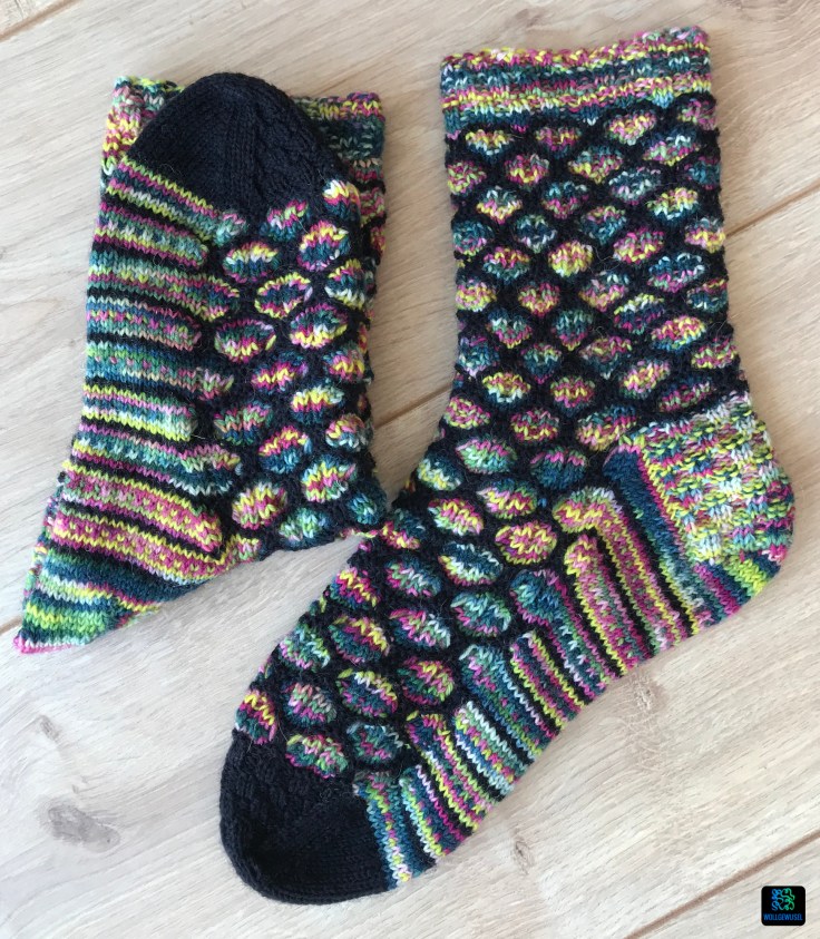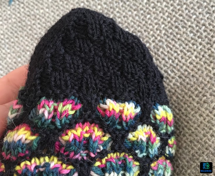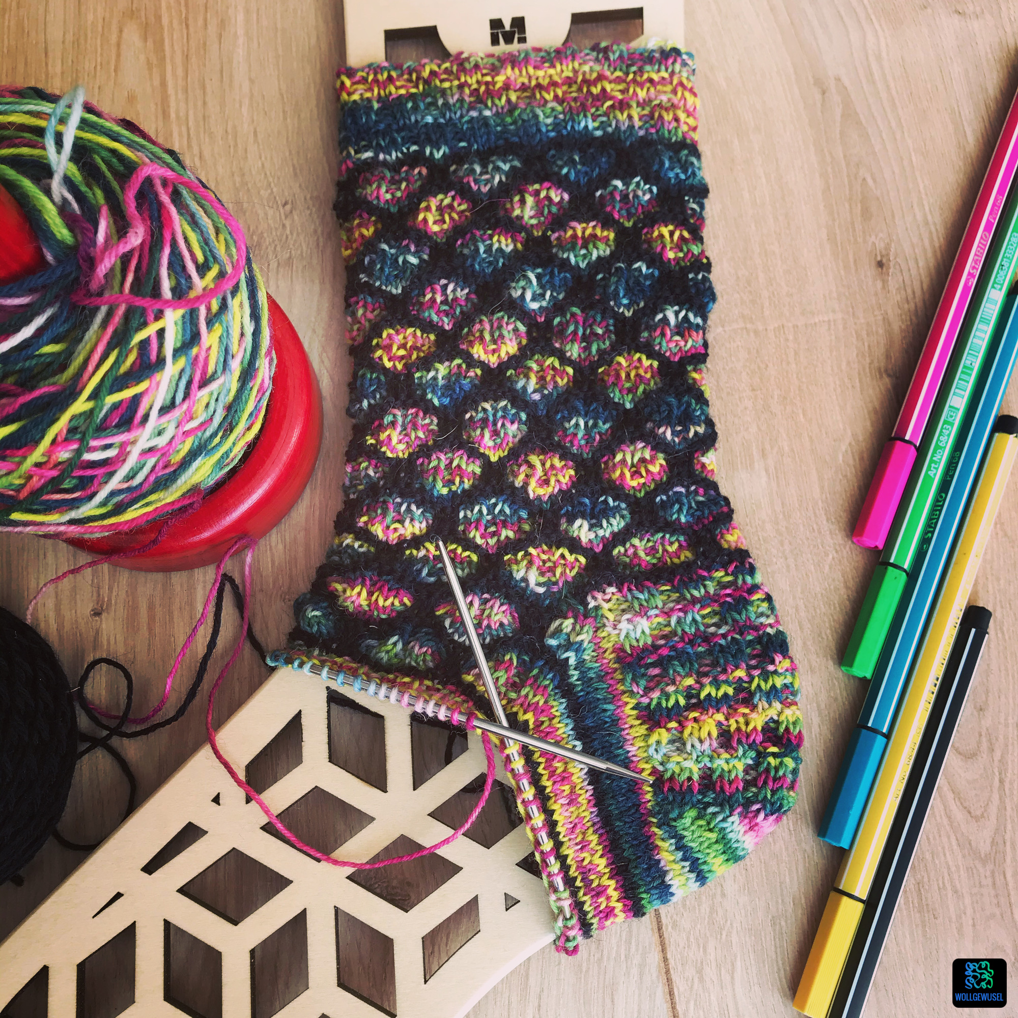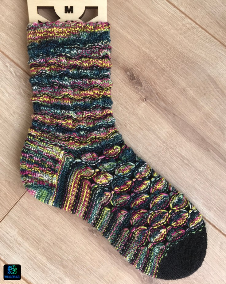 So, zurück zu den Socken. Das Muster hat mich gar nicht begeistert beim ersten Durchschauen. Zu sehr hat es mich an das Bubblemuster meiner Tatortsocken aus dem Dezember erinnert. Aber ich wollte mich qualifizieren. Also habe ich aus dieser negativen Grundeinstellung hinaus gedacht, ach, dann nimmst du halt auch ein Garn, das „weg muss“. Etwas, was mir nicht groß am Herzen liegt, weil es nicht meine Farben sind. So bin ich wieder zu dem quietschebunten, handgefärbten Sockengarn von den o.g. Socken vom Ende letzten Jahres gelandet. Dann fiel mir noch ein Rest schwarzes Garn in die Hand, zack, Kombination gefunden, los gings.