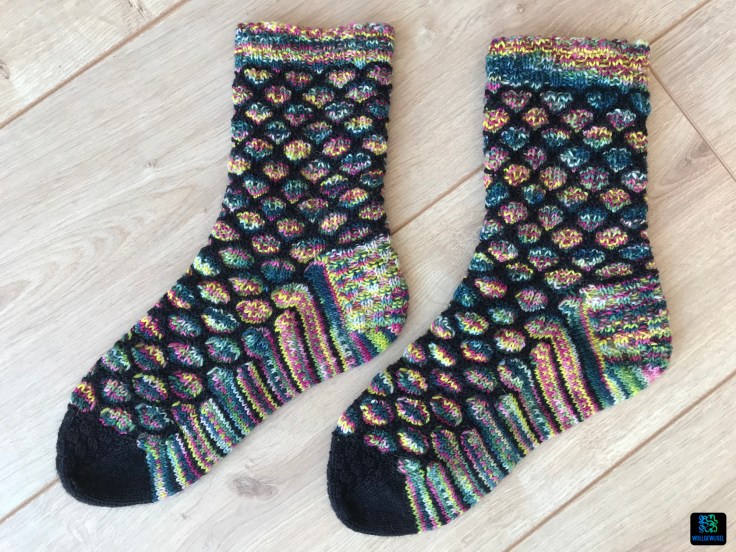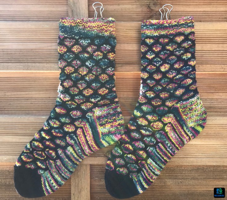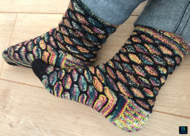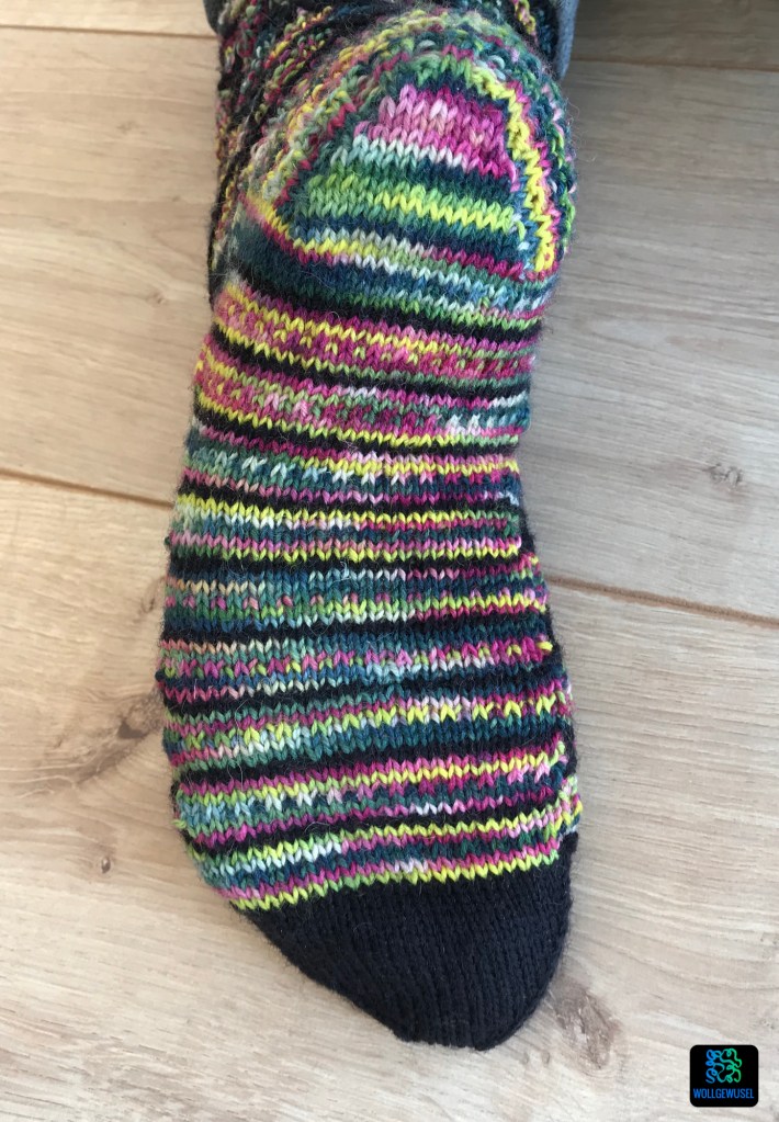 Schlussendlich muss ich sagen, es hat mehr Spaß gemacht als erwartet. Die fertigen Socken gefallen mir ebenfalls besser als das Muster mit meiner Garnauswahl vermuten ließ. Ich habe jetzt ein Paar echt bunte Socken, aber: das reicht jetzt erst mal. Ich bin da doch mehr für kontrollierten Farbeinsatz, mehr Farbharmonie und weniger Pink!