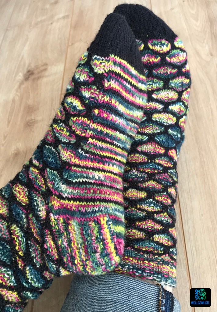 Schön fand ich, dass das rechts-links-Muster aus dem Bündchen zum einen auf Ferse und Spitze, aber auch als Hintergrund im Netzmuster fortgesetzt wird. Solche Details gehe in meiner Farbschlacht allerdings unter :D