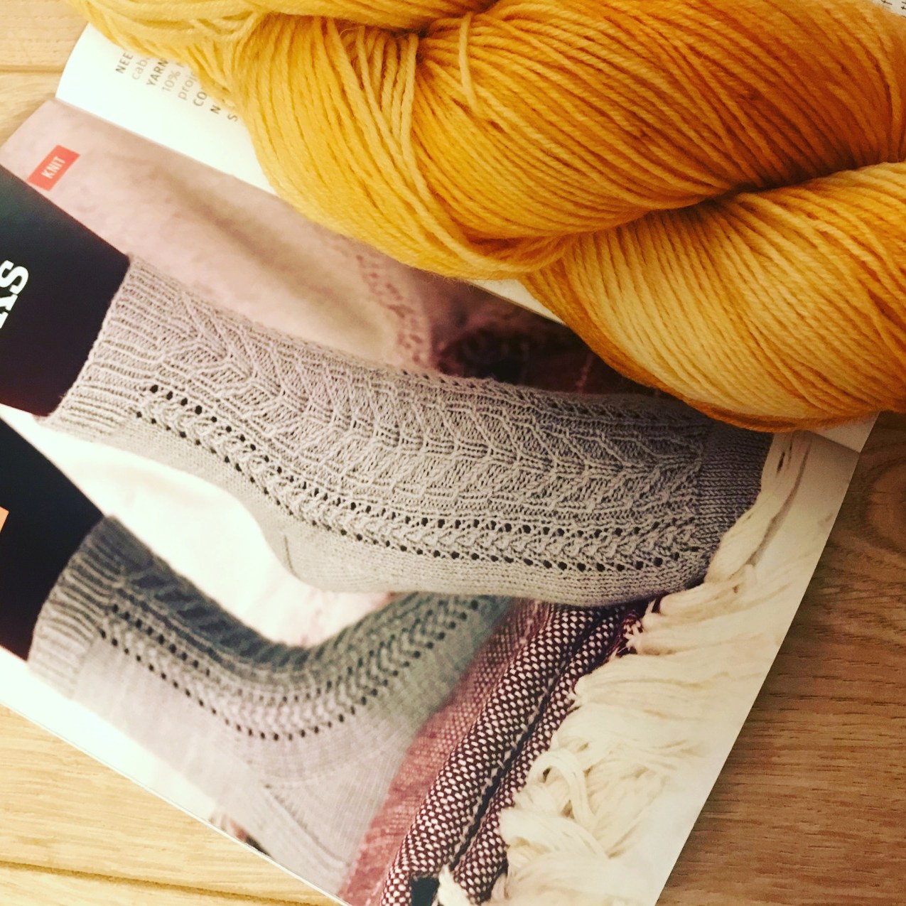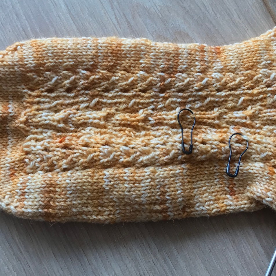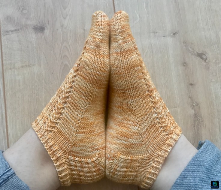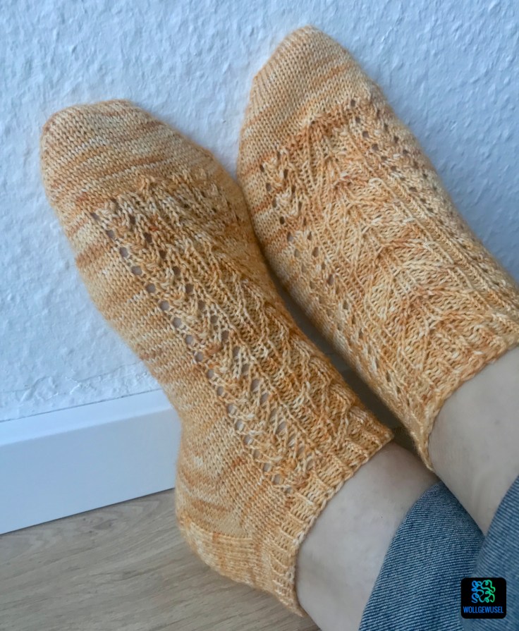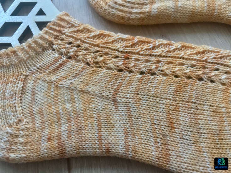 Gestrickt habe ich die Socken aus einem selbstgefärbten Sockengarn. Gefärbt mit Lebensmittelfarben. Rein vom Strang her hatte ich die Befürchtung, es würde vielleicht ein wenig langweilig aussehen. Ich habe beim Färben aus diesem Strang gelernt, man darf ruhig etwas mehr Farbe nehmen, man hat wirklich mehr davon. Allerdings bin ich begeistert, wie gut mir der „langweilige“ Strang nun doch verstrickt gefällt. Es ist ein Farbspiel aus gelb/orange/ocker/beige.