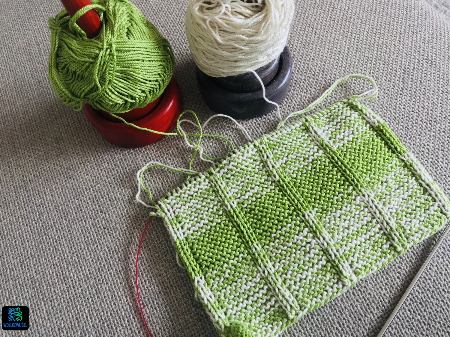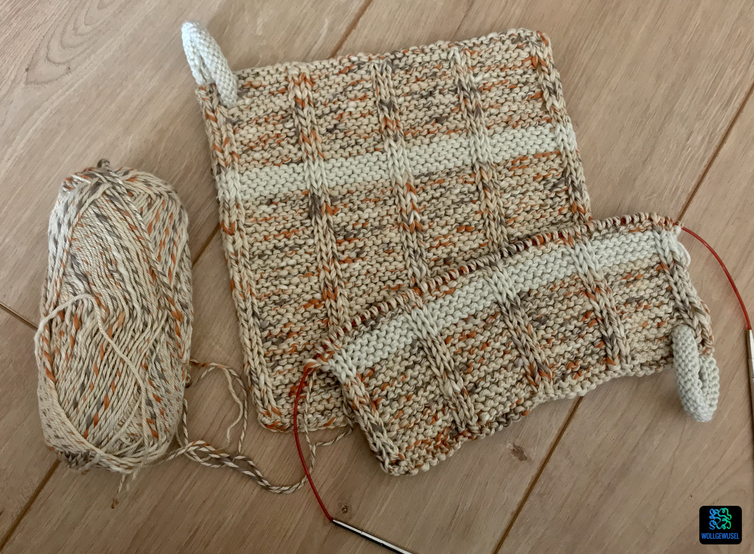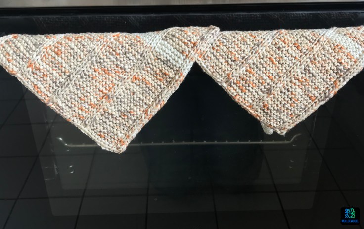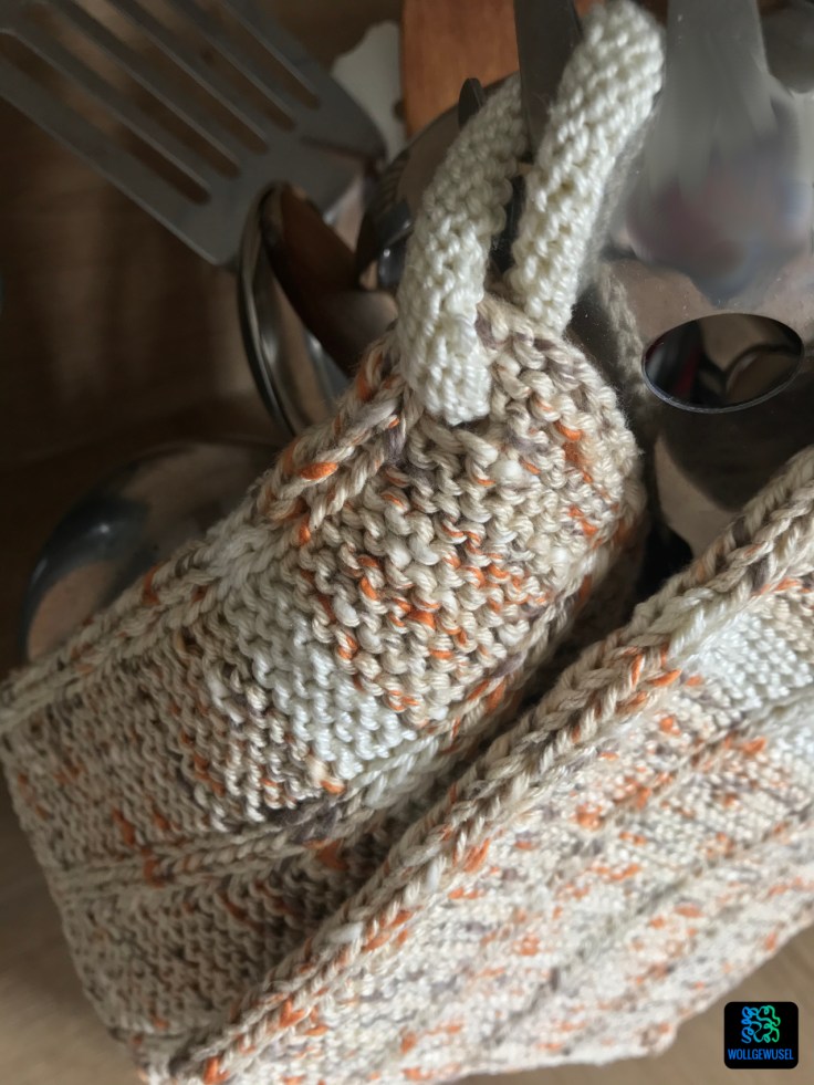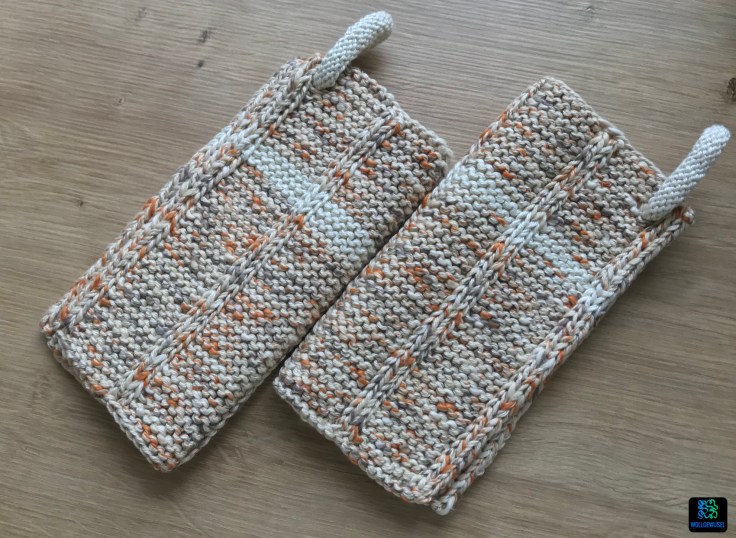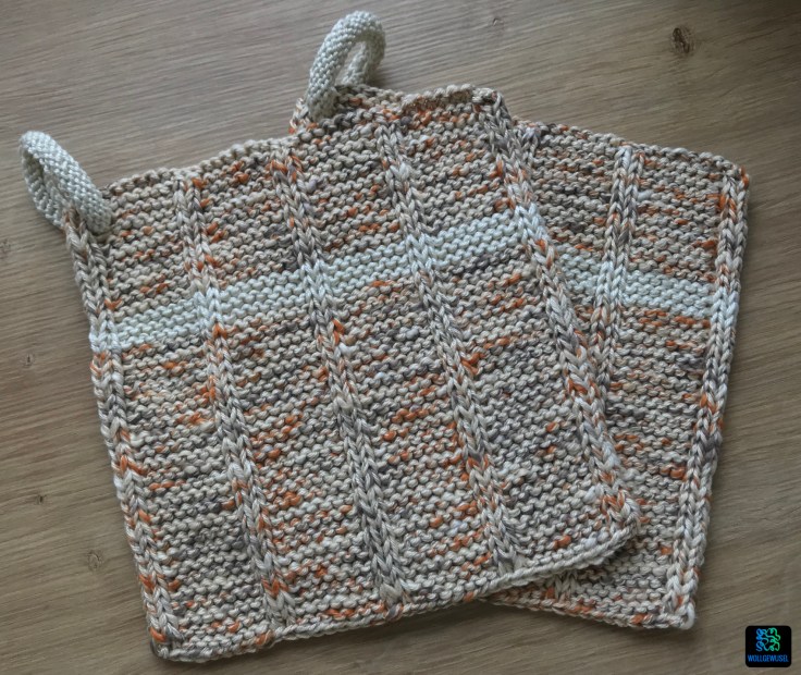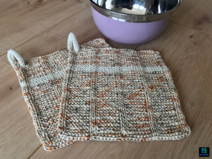 Leider hatte mich da meine Erinnerung getäuscht, ich dachte mit zwei Knäuel komme ich aus, um die Topflappen einfarbig daraus zu stricken. Aber die Anleitung belehrte mich eines besseren. Nun hatte aber das Paar Nr. 2 bereits gezeigt, dass ich weniger Garn brauche als vorgeschrieben und so konnte ich einen kleinen beigen Rest verwenden, um die Kringel und einen schmalen Streifen zu stricken und so etwas Garn von der Hauptfarbe zu sparen. Im Nachhinein hätte ich mir das auch sparen können, denn jetzt habe ich wieder einen Rest… :/ Und zwar immerhin 16g.