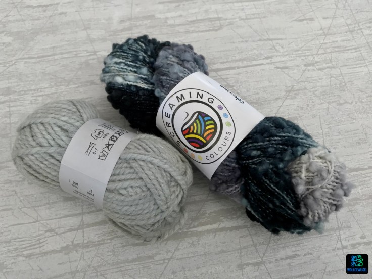 Ich habe hierfür ein Restknäul von meinem aller ersten Pullover, dem Blockstreifenpulli in Beerentönen, verwendet. Den hatte ich Ende 2017 aus Discounterwolle mit Woll- und Alpakaanteil gestrickt. Ja, tatsächlich habe ich festgestellt, dass das Garn zu 70% aus Poly besteht. Das war mit gar nicht mehr bewusst. Und ich trag den Pulli eigentlich ganz gerne. Das Garn war damals vom Discounter und eigentlich zum Stricken von Kissenhüllen offeriert worden. Da jedes Paket ein Knäul Kontrastfarbe enthielt, welches ich für den Pulli nicht gebraucht habe, schlummerte nun also noch ein hellgraues (und ein rosafarbenes *seufz*) im Wollberg.