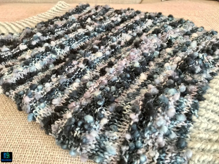 Für den Hauptteil habe ich etwas rumprobiert. Glatt rechts gestrickt, befanden sich die meisten der Noppen leider auf der Innenseite des Cowls. Ja sicherlich wärmen sie dort den Hals, aber ich wollte ja den optischen Effekt des Garns auf der Außenseite!