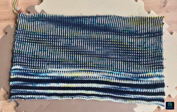Auf den Nadeln habe ich weiterhin meinen gestreiften Pullover aus der DesignerKnitting 03/2020. Mir fehlen jetzt noch ein paar Zentimeter bis ich Vorder- und Rückenteil separat weiterstricken muss. Das gefällt mir schon sehr gut. Faszinierend ist, dass ich gefühlt von dem dunkelblauen Garn trotz gleicher Lauflänge merklich weniger verbrauche als von dem handgefärbten Garn, obwohl die Anteile beim Stricken relativ ausgeglichen sind. Ich werde das beobachten. Die Optik des handgefärbten Garns gefällt mir jedenfalls sehr und erzielt den Effekt, den ich mir vorgestellt hatte. Ich glaube das wird gut. In Gedanken kombiniere ich mich mit dem Pullover schon quer durch meinen Kleiderschrank. :D