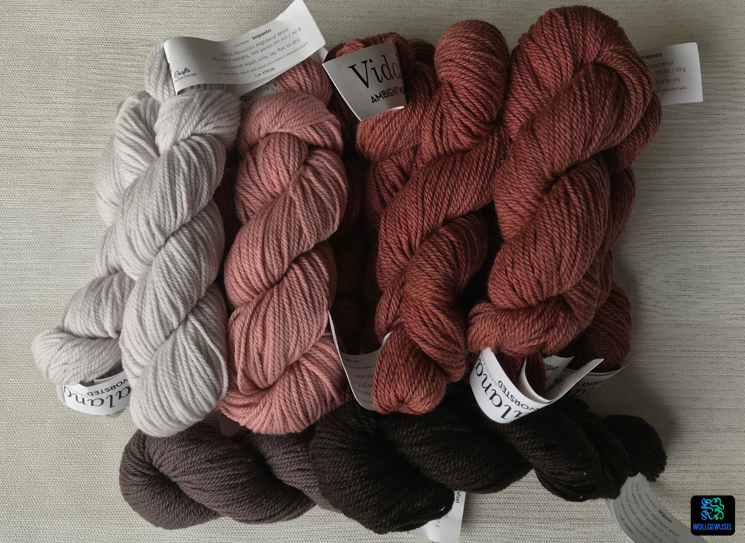 Alles fing mit meiner Knitcrate-Box aus dem November 2020 an. Diese enthielt 4x50g eines Garns aus 100% peruanischer Hochlandwolle mit einer Lauflänge von 90m/50g: die Ambient Worsted von Vidalana. Ich hatte mich bei der Vorauswahl der Box für ein Set in Erd-/Naturtönen entschieden