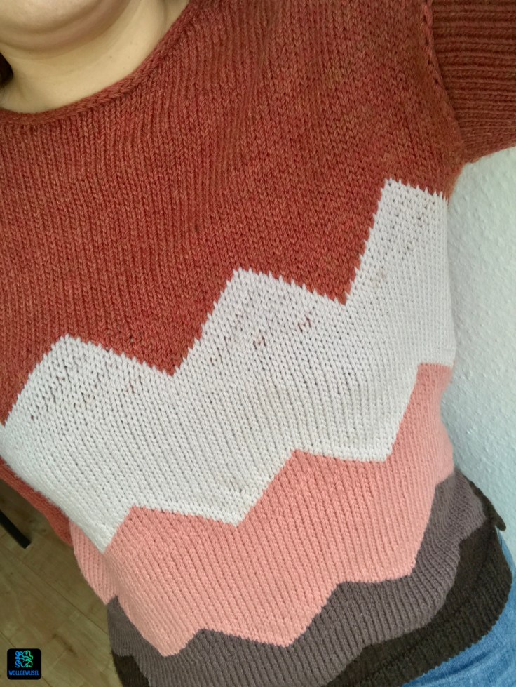 1. Der Pulli sieht ja auf der Rückseite genauso schön aus wie vorn – richtig toll geworden!! Ich dachte ehrlich gesagt, die schräge Textur an den Zacken sei Absicht… mir gefällt sie jedenfalls gut.