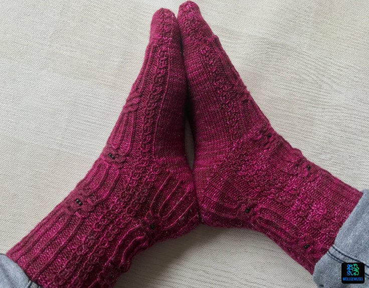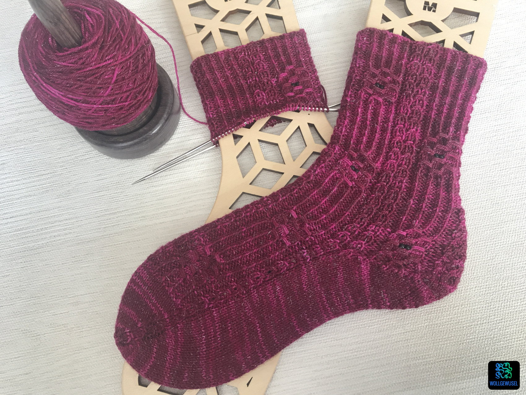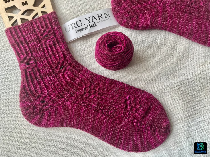 Achja, zum Garn muss ich ja auch noch was sagen! Ich habe eine Sockenwolle aus meiner Knitcrate-Box aus März 2020 verstrickt. Und zwar die Sugared Sock von Uru.yarns (Ravelry-Link). Das ist ein Merino-Sockengarn mit Stellina-Anteil. Es glitzert! Und die Farbe „Blood Moon“ gibt diese tollen Beerentöne. Da kann sogar ich mich für „pink“ begeistern.