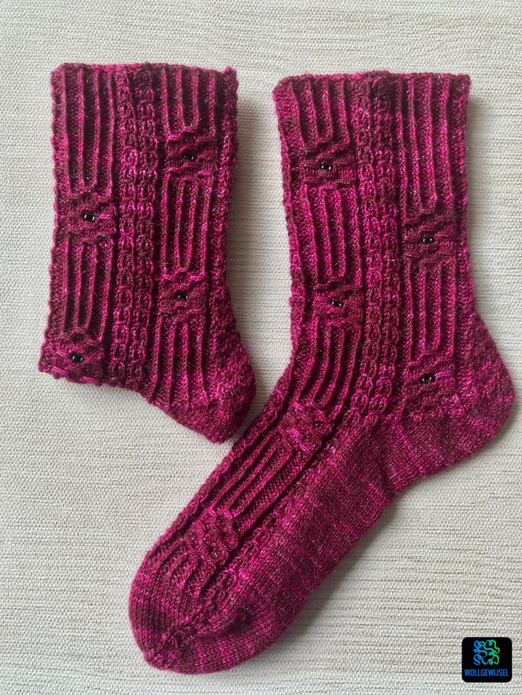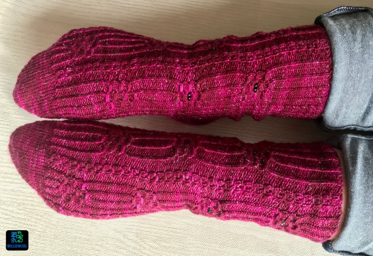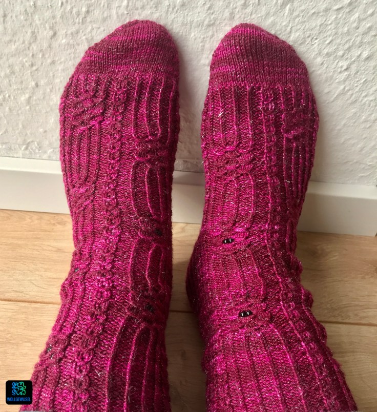 1. Gratulation, zur Teilnahme des bunten Nadelgeklappers. 👍 Ich finde die Socken klasse das hast du super gemacht. Ich hätte ja Angst das die Perlen drücken….