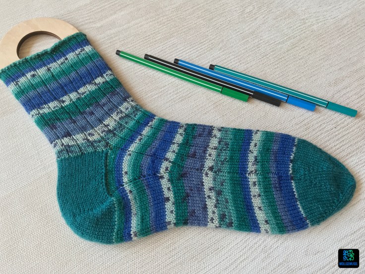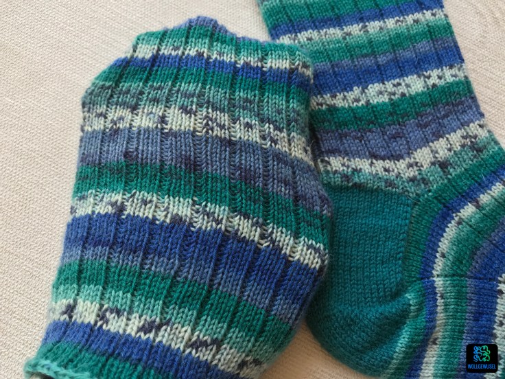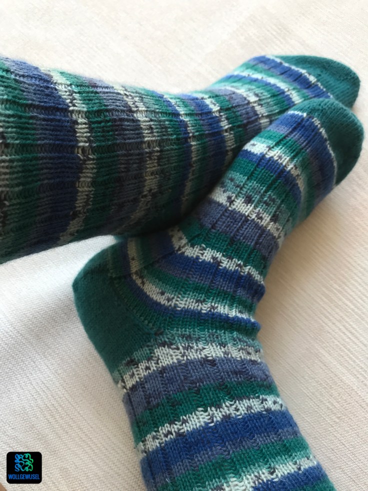 Gewählt habe ich eine selbstmusternde Sockenwolle tief aus meinem Wollberg. Es ist ein Standardsockengarn aus Schurwolle/Poly aus einem Discounter-Wollpaket, das in blau/grün/Petrol/weiß Streifen bildet. Für Spitze und Ferse habe ich mir ein petrolfarbenes Knäuel Jawoll Sockenwolle gegriffen, damit das Hauptgarn auch auf jeden Fall für die große Größe reicht. Aus dem gleichen Grund habe ich die Socken auch toe-up, also von der Spitze aus gestrickt.
