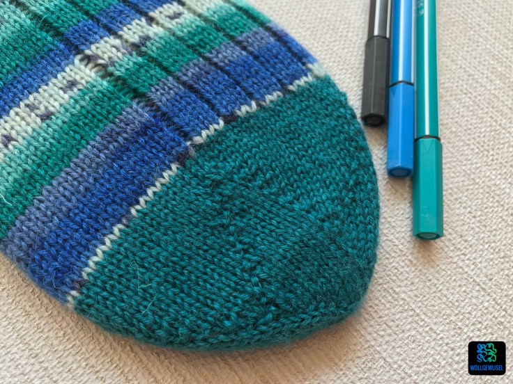 Wenn ich Socken vom Bündchen aus stricke, nutze ich sehr gerne die Schleudersternspitze. Auf Sockshype gibt es eine Anleitung, wie man diese Spitze auch toe-up stricken kann. (hier) Das habe ich bei diesen Socken das erste Mal getestet und das Ergebnis gefällt mir sehr gut. Das werde ich häufiger machen. Denn bei einer Bandspitze ziehen sich bei mir am großen Zeh entlang der Abnahmen häufig die Maschen groß, sodass es wie Löcher aussieht. Die Schleudersternspitze hat sich diesbezüglich bewehrt.