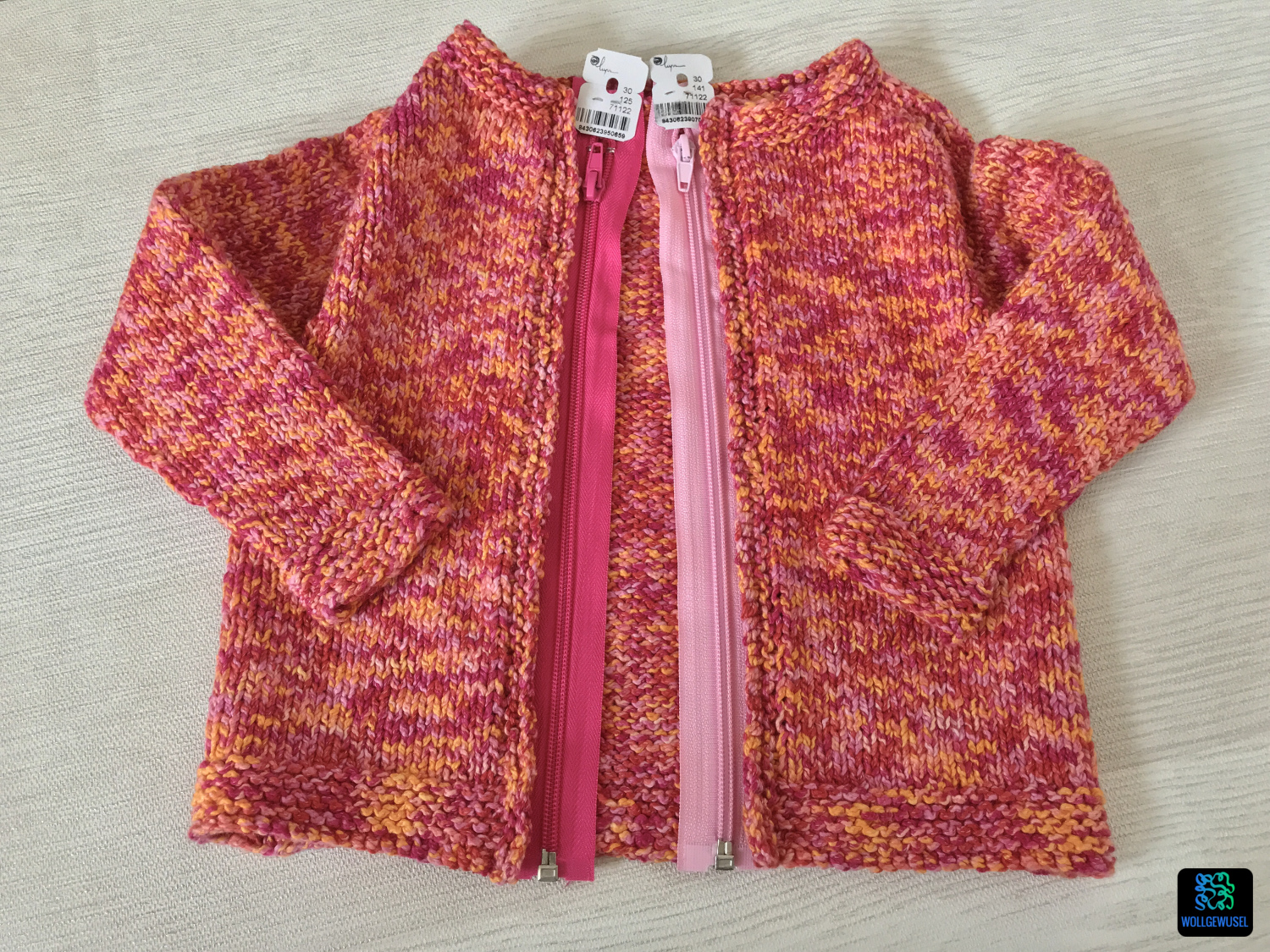 Ich hatte mich übrigens für einen Verschluss mit Plastikzähnen entschieden, da diese aufgrund des Gewichts für Kinderkleidung irgendwie besser geeignet sind, finde ich. Gleichzeitig ist er auch nicht zu fein und passt so ganz gut zu der Garnstärke.