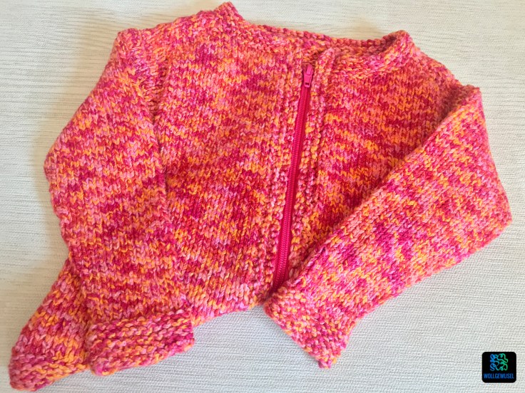 In der kleinen Größe entstand die Grundform der Jacke schnell und schon wurden Frontblenden und Halsbündchen angestrickt. Also wirklich, einfach stumpf der Anleitung folgend kann da nicht viel schief gehen. Nur das Aufnehmen der Maschen aus Vorder- und Rückenteil in der Armkugel hat nicht ganz so gut geklappt. Da war in der Anleitung eine deutlich kleinere Anzahl Maschenangegeben als ich bei gleichmäßigen Maschenaufnahme aus dem Kettrand zusammen bekam. Deshalb habe ich in der ersten Runde der Ärmel viele Maschen zusammengestrickt, um die Anzahl zu reduzieren. Das sieht man optisch aber mehr als ich es gern hätte. Da hätte ich die Abnahmen lieber auf mehrere Runden verteilen sollen. Leider fiel mir das erst auf als der Ärmel fast fertig war. Naja, verbuchen wir es unter Lerneffekt! :/