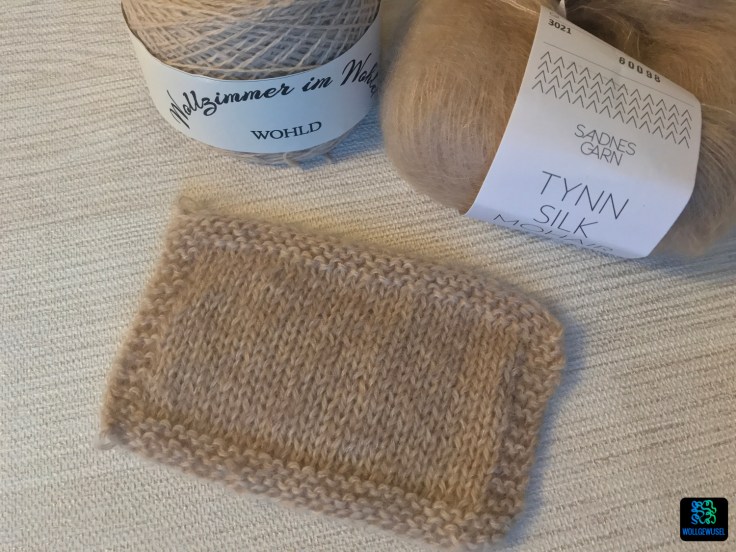 So richtig ist der Contrast Sweater von PetiteKnit (ravelry-Link) immer noch nicht auf die Nadeln gehüpft. Aber ich habe zumindest schon mal die Maschenprobe gestrickt. Hierfür verwende ich ebenfalls Wolle, die ich in Silberstedt gekauft habe. Es ist eine reine Schurwolle mit 288m/50g von Sabine bzw. dem Wollzimmer im Wohld. (Leider gibt es hierzu keine aussagekräftige Internetpräsenz.) Ich habe mich für beige und rostrot entschieden. Dazu habe ich mir passende Knäule der Tynn Silk Mohair von Sandnes bestellt. Ich mag das Garn einfach unheimlich gerne!