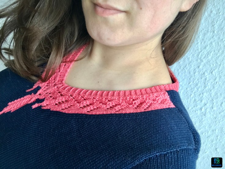 Das Shirt wird von unten nach oben und in Teilen gestrickt. Es ist viel glatt rechts und der Hingucker ist auf jeden Fall die farblich abgesetzte und kunstvolle Einfassung des Halslochs. Dadurch dass relativ dünnes Garn verwendet wird, ergibt sich ein dünnes, aber (zumindest bei meiner Variante) sehr feines und akkurates Gestrick. Sehr angenehm. Aber natürlich auch ein wenig Fleißarbeit. Den Hauptteil des Shirts habe ich nämlich mit Nadelstärke 2,75mm gestrickt…