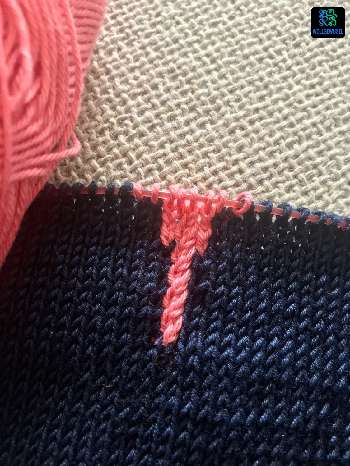Die Einfassung des Ausschnitts wird mit der Intarsientechnik gleich mit eingearbeitet. Hierbei arbeitet man je Farbabschnitt mit einem separaten Knäul und verkreuzt an den Kontaktflächen hinter der Arbeit die Fäden, sodass sich keine Löcher bilden.