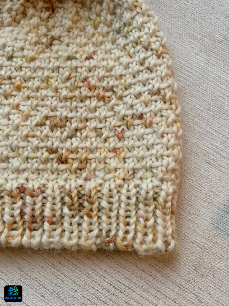 Wie bereits bei meiner ersten Mütze nach diesem Design, die du hier findest, habe ich auch das Bündchenmuster geändert und es etwas länger gestrickt. Ich habe hier allerdings keine rechts verschränkten Maschen sondern ganz einfach „1re, 1li“ gestrickt. War eine spontane Entscheidung. Als Anschlag habe ich den Tubular Cast on für die schöne runde Kante genutzt.