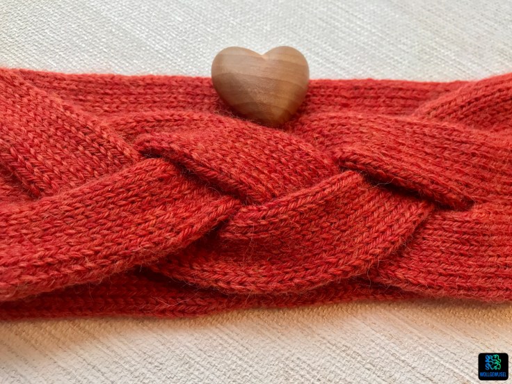 Nach dem vorsichtige Wunsch nach einem gestrickten Stirnband habe ich gemeinsam mit meiner Kollegin sowohl bzgl. des gewünschten Designs als auch bzgl. der Garnwahl (Faser und Farbe) viel hin und her überlegt. Beim Design hat das Braidhead von Rille Rundt (ravelry-Link) gewonnen. Ich muss sagen, das gefällt mir auch. Es ist ein überwiegend glatt rechts gestricktes Stirnband, das im Bereich der Stirn durch einen Flechtzopf auffällt.