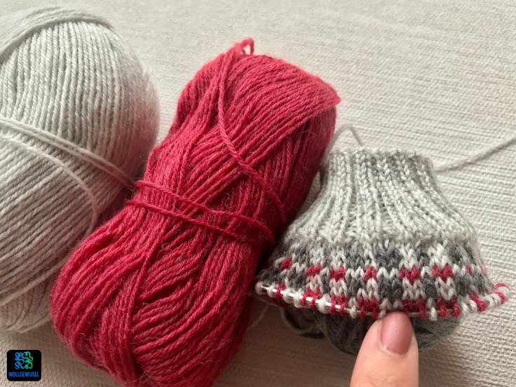 Gestrickt habe ich aus einer sehr gut abgelagerten Discounter-Sockenwolle aus meinem Wollberg und freue mich, dass so schöne Socken draus geworden sind. Denn auch diese Socken passen mir wieder perfekt. Nicht selbstverständlich in der SM.