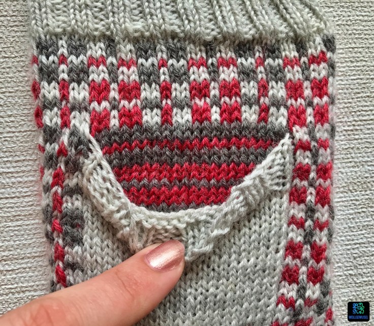 Das Colourworkmuster startet nach einem einfachen Rippenbündchen. Auch wenn das Muster dreifarbig ist, werden pro Runde immer nur zwei Farben benötigt. Nach einem Mustersatz kommt dann die Tasche und das ist wirklich mal was neues gewesen. Diese wird nämlich gleich mitgestrickt. Runde für Runde. Da strickt man dann im Bereich der Tasche das Bein und die Tasche auf der gleichen Nadel zur selben Zeit und allein das Führen der Arbeitsfäden entscheiden darüber, ob man zwei voneinander unabhängige Lagen Gestrick erzeugt oder ob sie am Ende unrettbar miteinander verbunden sind.