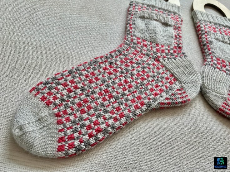 Faszinierend fand ich wieder ein Mal wie unterschiedlich diese Socken in Abhängigkeit von den gewählten Farben wirken. Selbst wenn es die selben Farben sind und man nur die Zuweisung zu Haupt- und Kontrastfarbe 1 und 2 tauscht, kommt da eine völlig andere Socke bei heraus. Da bietet dieses Muster quasi unendliche Gestaltungsmöglichkeiten.