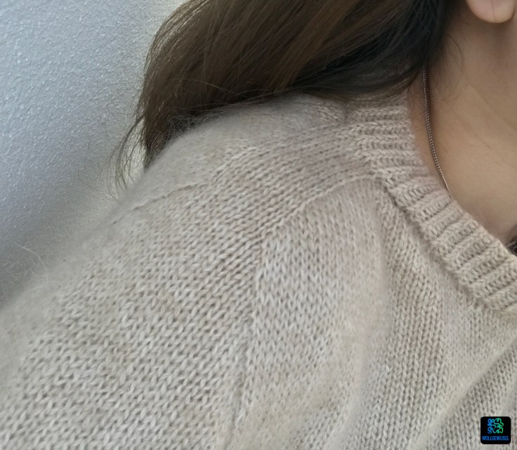 Der Pullover wird von oben nach unten gestrickt. Die Konstruktion der Schultern finde ich genial, wenn auch nicht intuitiv im Vergleich zu den sonst viel verwendeten Techniken. Eigentlich ist es irgendwie eine Kombi aus verschiedenen Schritten. Optisch sieht es nach Sattelschultern aus, aber trotzdem strickt man alles in einem Rutsch ohne irgendwo Maschen abzuketten oder stillzulegen bzw. neu aufzunehmen. Man strickt immer in der Runde und allein durch verschiedene Zunahmetechniken entwickelt sich diese Schulterkonstruktion, die zumindest bei mir ganz hervorragend sitzt!
