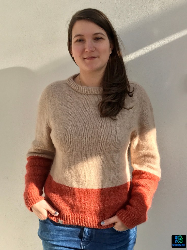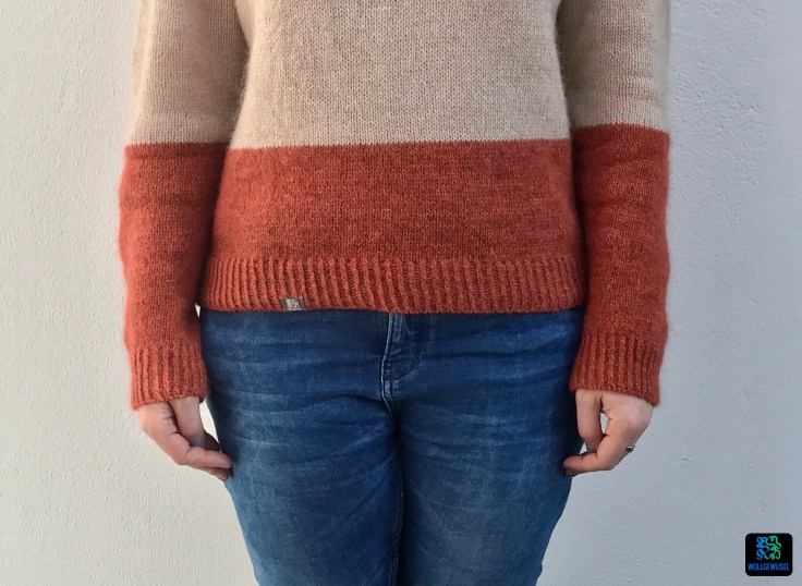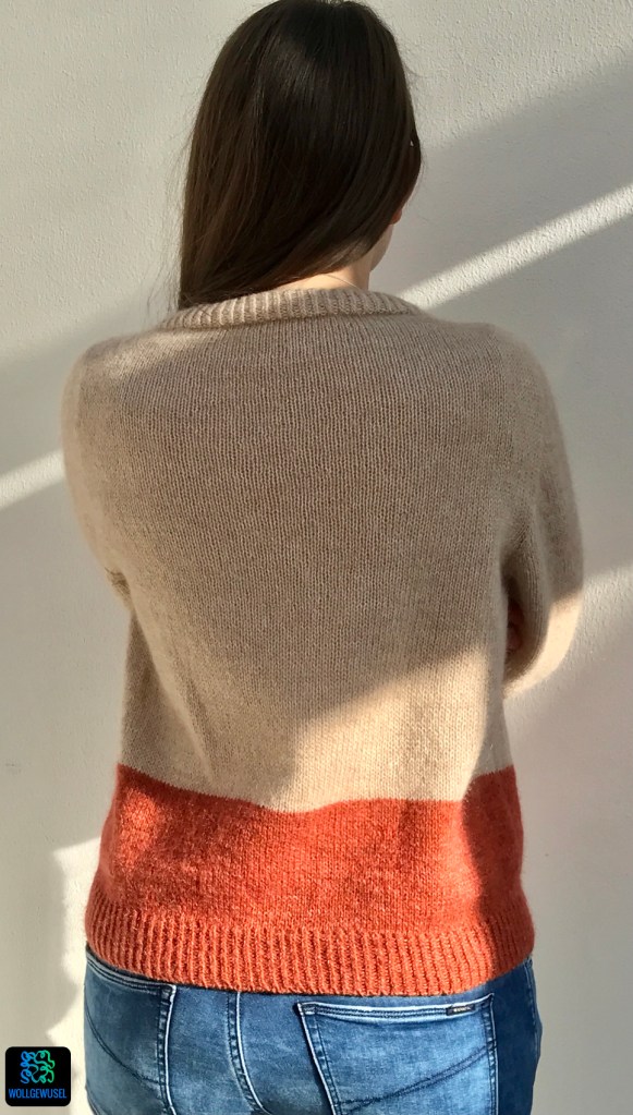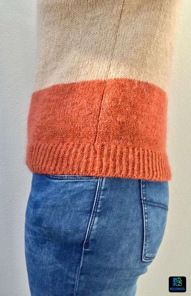 Nach dem Abteilen der Ärmel geht es einfach ganz viel glatt rechts im Kreis weiter. Ich habe keine Taillierung gestrickt. Der Zeitpunkt für den Farbwechsel wird in der Anleitung vorgegeben. Ich habe ich aber noch etwas herausgezögert, weil ich etwas Sorge hatte, dass sonst mein Mohairgarn für den rot-orangen Teil nicht reicht. Schließlich soll der Farbwechsel am Körper und den Ärmeln auf gleicher Höhe erfolgen. Da bei mir die Ärmel aber eigentlich immer mindestens genauso lang, häufig auch noch etwas länger als der Körper sind, musste ich natürlich den Bedarf für die beiden Ärmel auch sinnvoll mit einkalkulieren. Das hab ganz gut geklappt. 8g Mohair der Kontrastfarbe hatte ich am Ende noch über.