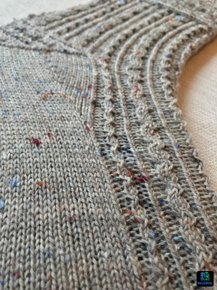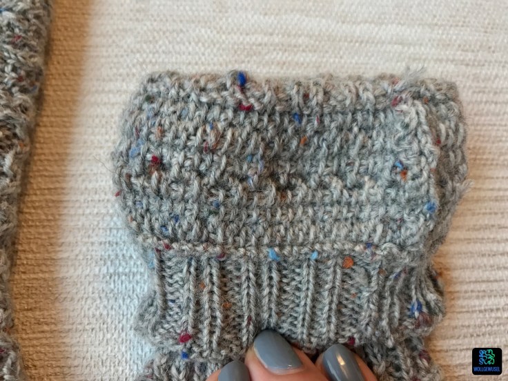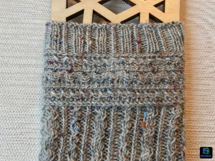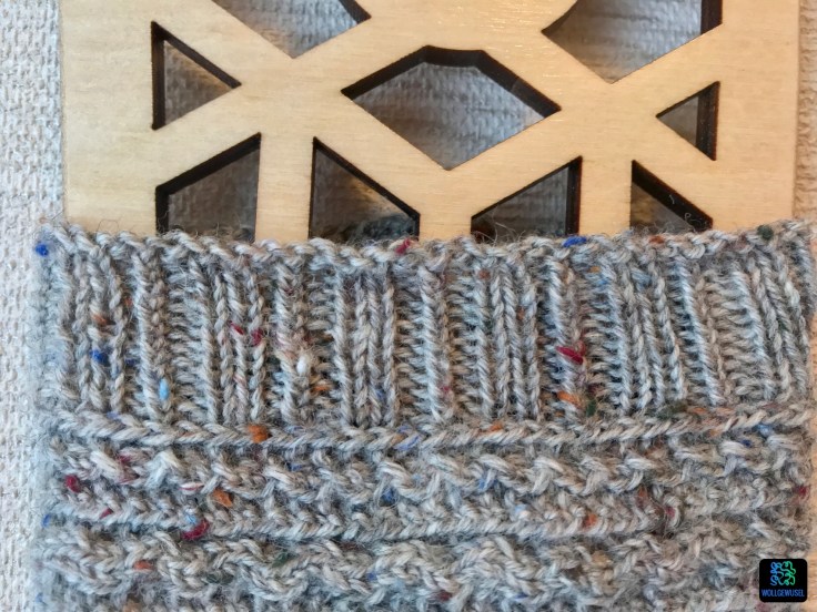Verstrickt habe ich ein Tweed-Sockengarn von Regia. Ein Klassiker quasi. Das ließ sich gut verarbeiten. Nur bei den engen Maschen durch Verzopfung und Verschränken etc. piekte man dann doch ab und zu mal in den Faden und er faserte so unschön auf. Vom Maschenbild her gefällt sie mir aber sehr gut und ich hoffe sie ist schön langlebig.