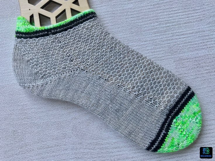 Mein erstes Paar sitzt nämlich einfach Bombe und die Fersenlasche ist für meine Fuß genau richtig und strickt sich super. Außerdem mag ich die Streifen und das dezente links-rechts-Muster auf dem Oberfuß.