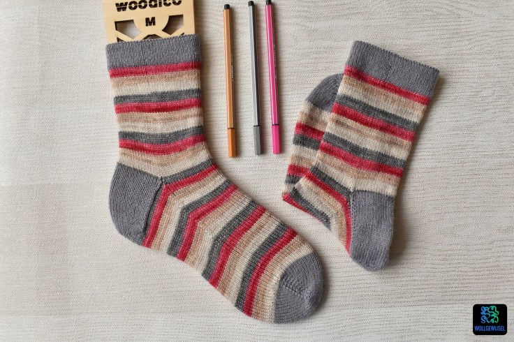 Verstrickt habe ich nämlich ein selbststreifendes Sockengarn von Nicole C. Méndez. Die Färbung heißt „Hogwarts Acceptance Letter“. Das Garn kann man also ganz in Ruhe runter stricken und man erhält gleich breite Streifen in einer wiederkehrenden Farbabfolge. Ich hatte mir die Streifen beim Kauf des Garns zwar etwas roter, sprich weniger pink, vorgestellt, aber nun gut. Fotos sind geduldig. Aber das Ergebnis gefällt mir trotzdem ganz gut. Es sind nun Streifen in wollweiß, beige, rot-pink und grau. Bei dem Garn handelt es sich um ein Sockengarn mit 80% Merino und 20% Polyamid.