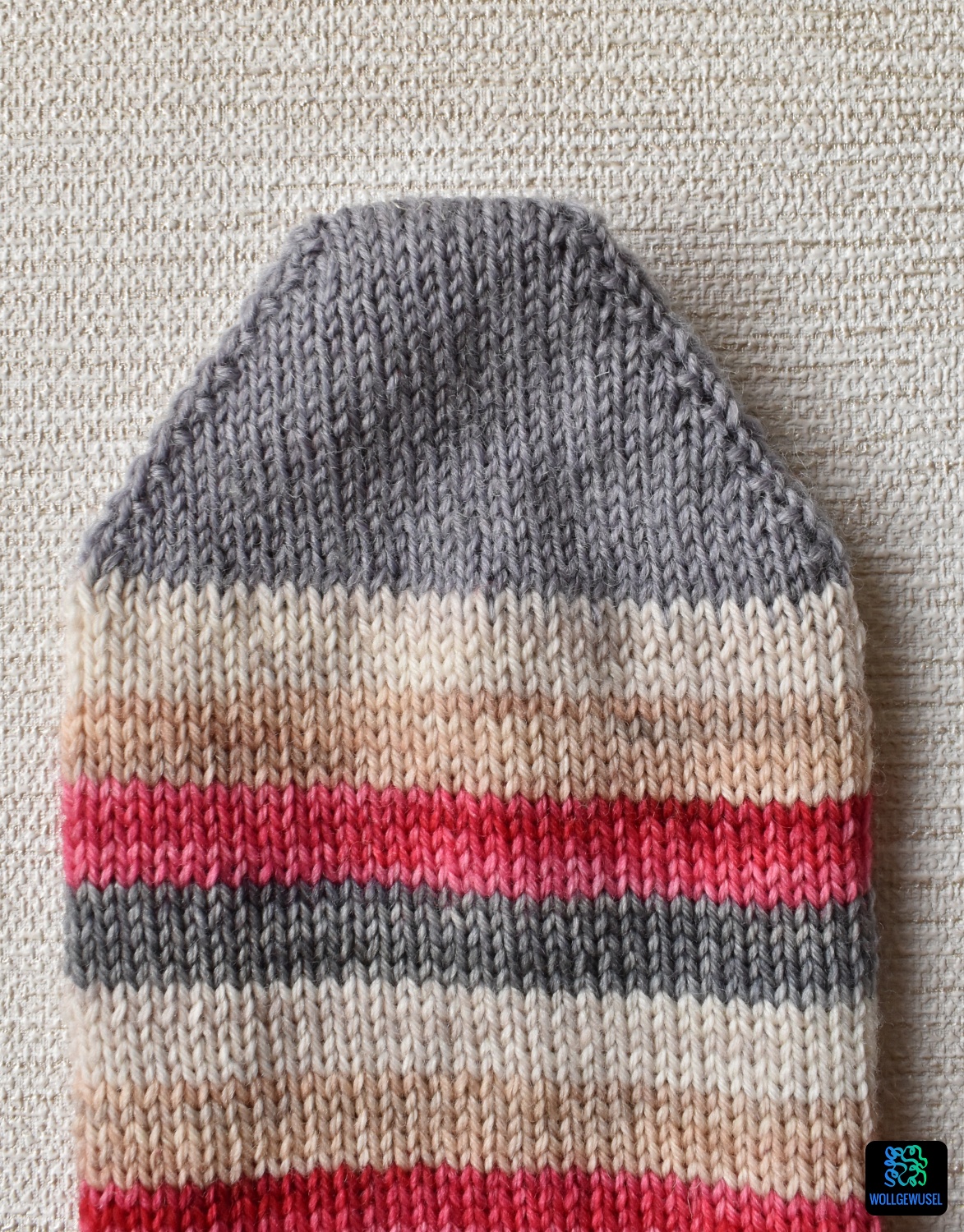 Für das Bündchen habe ich nach der gewünschten Bündchenhöhe in glatt rechts eine Runde linke Maschen und dann noch einmal glatt rechts gestrickt. Allerdings eine Runde weniger als vor der linken Runde. Nach dem elastischen Abketten habe ich das Bündchen an den linken Maschen nach innen umgeklappt und am Übergang vom Ringelgarn zum Bündchen innen festgenäht. Da muss ich jedes Mal wieder schauen, wie man das am besten macht, aber dann klappt es gut. Das gibt es in der Anleitung vom Mytilus von Jana Huck eine bebilderte Anleitung, da dort die Bündchen und an Ärmel und Bündchen nämlich auch so gemacht werden. Vielleicht kann ich mir das dann ja irgendwann auch einmal merken. :D