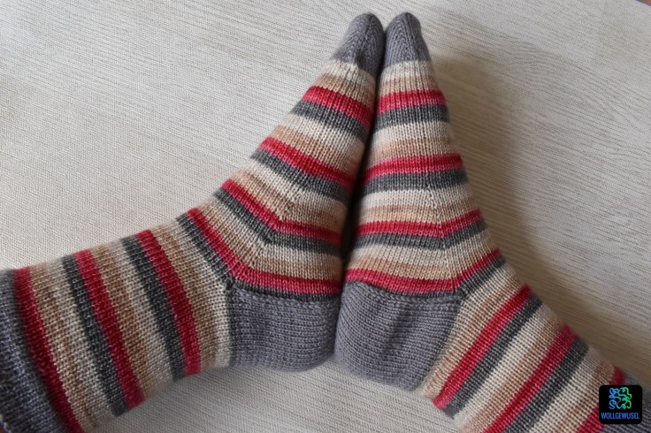Verbraucht habe ich von dem Ringelgarn nur 53 Gramm. Da kann ich also noch einmal ein Paar mit einem etwas kürzeren Schaft oder für eine kleinere Schuhgröße stricken. Da das Garn aufgrund des großen Aufwands beim Färben relativ teuer ist, finde ich es schön, dass ich es so optimal ausnutzen kann. Die 100g-Stränge liegen bei um die 30€ (inkl. Versand). Das ist natürlich eine Stange Geld und ich habe sehr lange immer mal wieder durch das Sortiment gestöbert, bevor ich dann in diesem Frühjahr tatsächlich einen Strang gekauft habe. Das ist sicherlich nichts was zum Standard wird, aber mal so als Highlight ist es eine schöne Sache und das Stricken macht einfach mega Spaß!