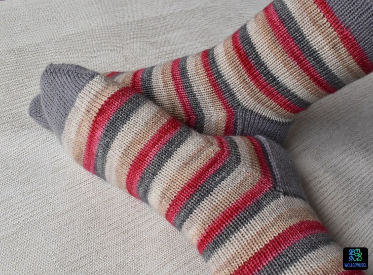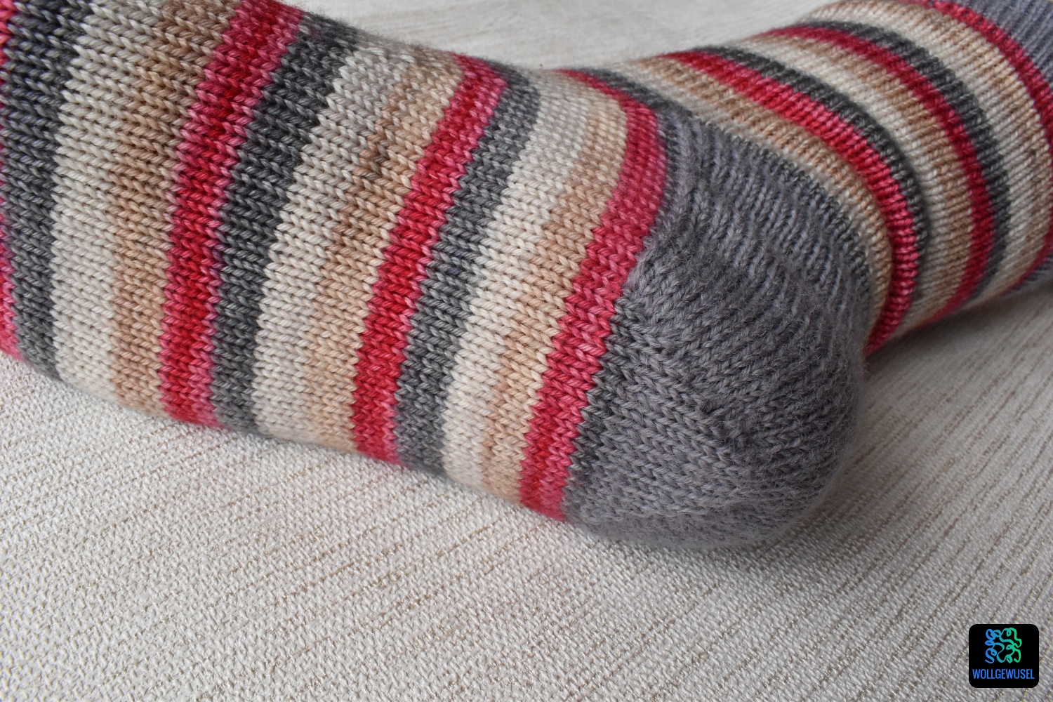 Damit die Streifen schön gleichmäßig rauskommen, habe ich Spitze, Ferse und Bündchen mit einem passenden, unifarbene Garn gestrickt. Ich habe mir dafür ein graues Sockengarn vom Discounter ausgesucht, das ziemlich gut das Grau der Ringel trifft.