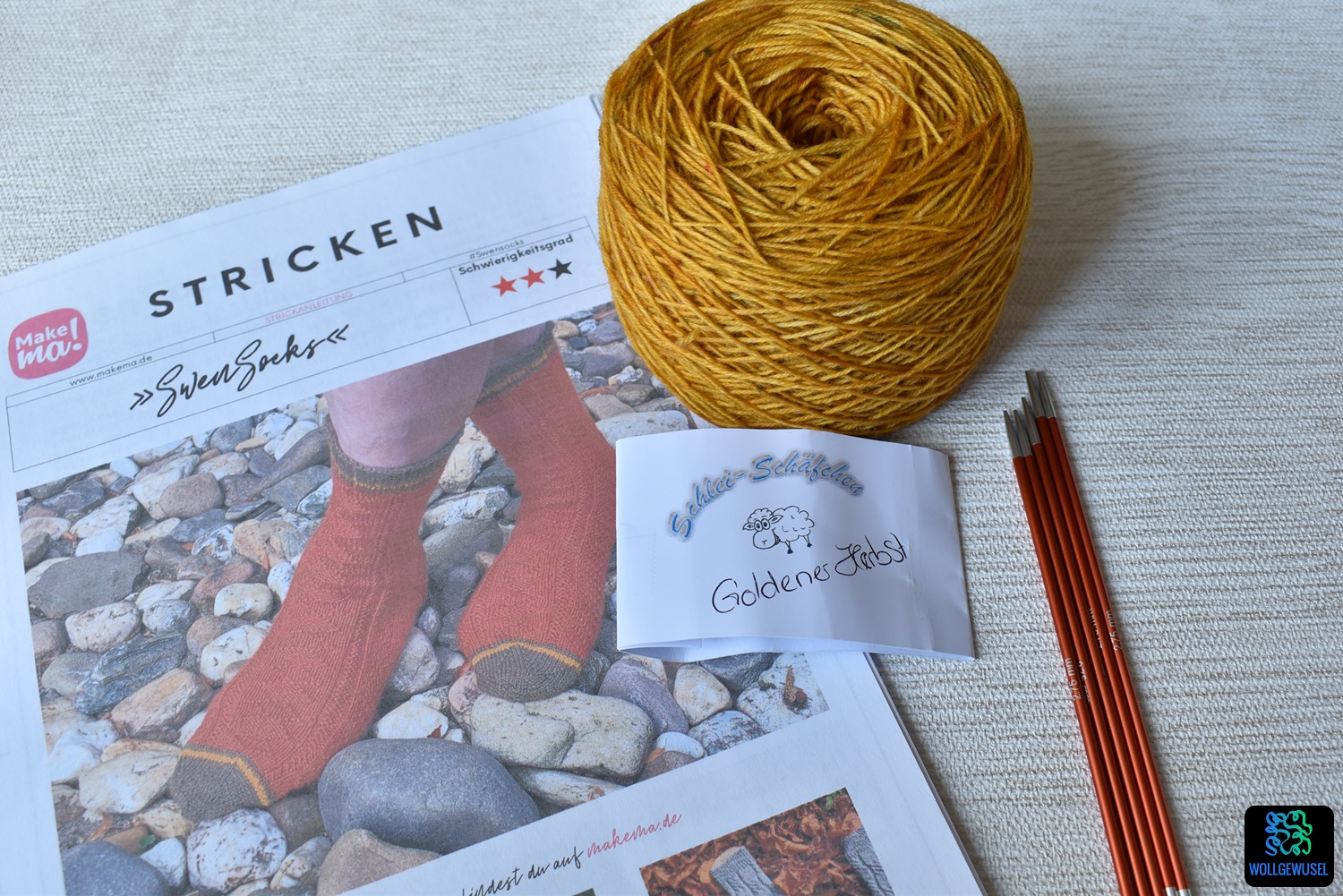 Damit das Muster gut zur Geltung kommt, habe ich mich für eine semisolide Färbung vom Schlei-Schäfchen entschieden. Diese habe ich im letzten Jahr bei Wolle zwischen den Meeren in Silberstedt gekauft, s. hier. Das Garn hat einen wunderbar kräftigen, warmen und tiefen Gelbton, den ich leider nur mal mehr und mal weniger auf den Fotos einfangen konnte. Es ist ein normales 75/25-Sockengarn, dafür aber angenehm weich.