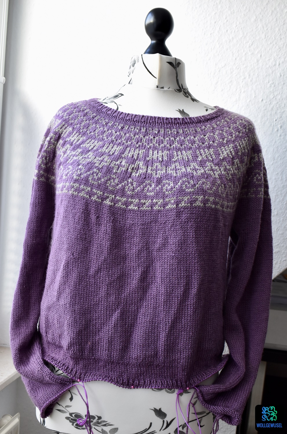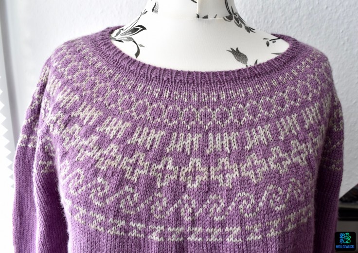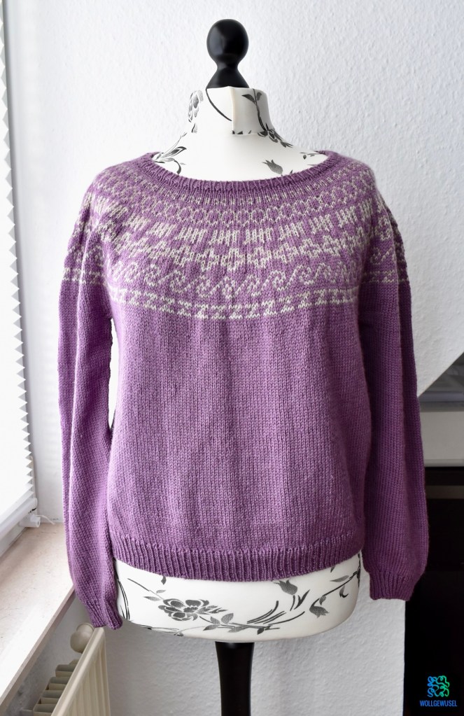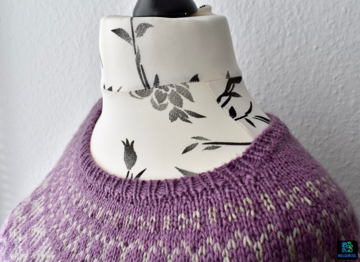 Bei der Garnwahl war ich etwas unentschlossen. Die Maschenprobe mit 22 Maschen auf 10cm ist für mich so Zwischending. Naja, so nichts halbes und nichts ganzes. 19 oder 20 Maschen, kein Problem. 24M auch gar kein Problem. Aber 22 Maschen.. also musste ich erst mal herumprobieren. Am Ende hatte ich zwei Varianten für die Hauptfarbe ausbaldovert. Einmal die 300m/100g-Variante der deutschen Merinowolle von GrosseWolle und einmal ein Superwash Merinogarn von Rowan, die Rowan PureWool Superwash DK. Letztere hatte ich als 500g-Menge schon lange im Wollberg und so richtig warm geworden bin ich damit nie. Das lag hauptsächlich an der Farbe. Alles was in Lila/Rosa-Richtung geht ist einfach kritisch. In den letzten Monaten bin ich da allerdings deutlich offener geworden. Dies war auch der Grund, warum ich mich nun doch für dieses Garn entschied. Es war Zeit für ein lilanes Kleidungsstück! Über den Tellerrand schauen! Raus aus der Komfortzone!…
