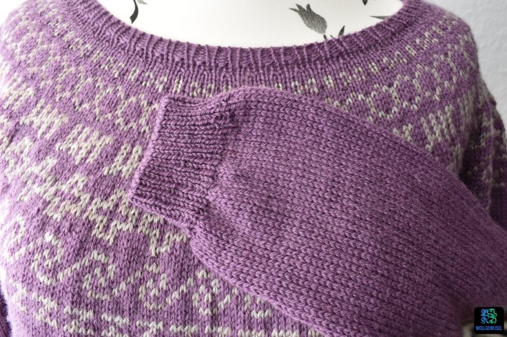 Leider hatte ich mir beim Strickprozess inzwischen eingestanden, dass ich den Pullover in dieser Farbe wohl doch nicht so würde wertschätzen können, wie er es verdient. Ich hatte mich hier farblich einfach verschätzt. Während ich noch dabei war diese Entschiedung zu akzeptieren, bewunderte meine Kollegin aber bereits „diese tolle Farbe“. Da sie eine der meinen ähnelnde Statur hat, war der Ausweg schnell gefunden. Ich habe dann Ärmel und Körper bis knapp vor die Bündchen gestrickt und den Pullover dann noch einmal gebadet, damit sie ihn anprobieren konnte. Dann waren nur noch keine Anpassungen nötig und schwups war der Pulli fertig. Die Abschlussbündchen habe ich dann aber doch mit verschränkten Maschen gestrickt. Schließlich sollen diese vernünftig sitzen.
