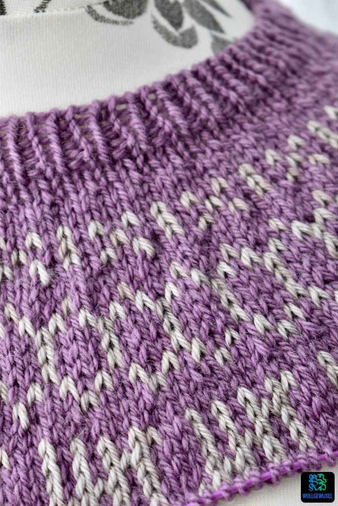 Die Rundpasse besteht aus sieben verschiedenen kleinen Mustern, die jeweils einmal fortlaufend in der Runde gestrickt werden. Da die Muser relativ zierlich sind, sind die Spannfäden, die man innen mitführen muss, auch größtenteils kurz. Maximal zwischen den einzelnen Musterwiederholungen muss man mal einen Faden einweben. Ich mache das immer bei mehr als fünf Maschen einer Farbe.