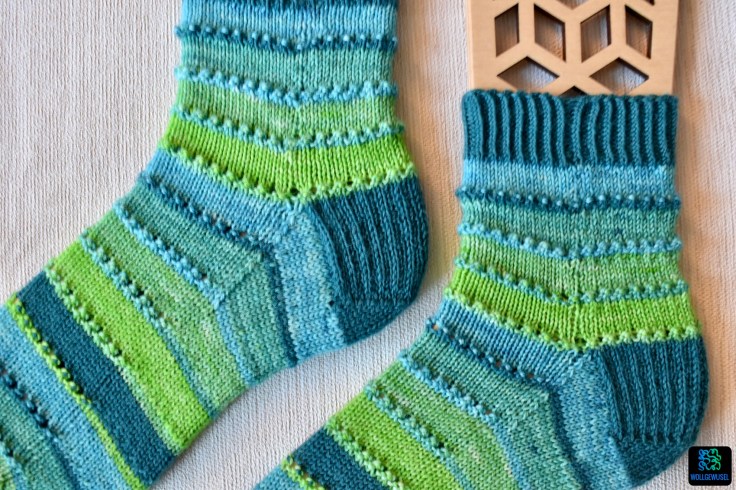 Ich habe die Farbtöne im Verlauf angeordnet, aber das kann man ja machen wie man will. Das Muster baut sich aus Farb- und Kontraststreifen auf, wobei der Kontraststreifen immer die Farbe des vorletzten Farbstreifens hat. Aber auch hier: mach es wie du magst. Die Kontraststreifen werden außerdem durch ein kleines Strukturmuster betont. Nur unter dem Fuß werden sie glatt rechts gestrickt.